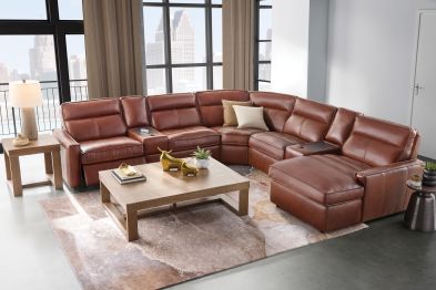 Bring home the ultimate blend of modern style and tailored relaxation with the Berlin Dual Power Leather Reclining Sectional. Wrapped in luxurious top-grain leather, this collection showcases a rich chestnut hue that radiates warmth and sophistication. Clean track arms add a contemporary edge, perfectly complementing the sleek, structured silhouette. Engineered for supreme comfort, this sectional features dual power reclining mechanisms that allow you to independently adjust the headrest and footrest at the touch of a button, as well as feather down seating so you're always comfortable. Whether you're unwinding after a long day or hosting movie night, each seat offers personalized support and relaxation. Its modular design gives you the freedom to customize your layout to fit your space. Additional integrated features like wireless charging, cupholders, and hidden storage in the console add next-level convenience. From the wide chaise lounge to the deeply cushioned seats, every detail is crafted for both style and comfort.