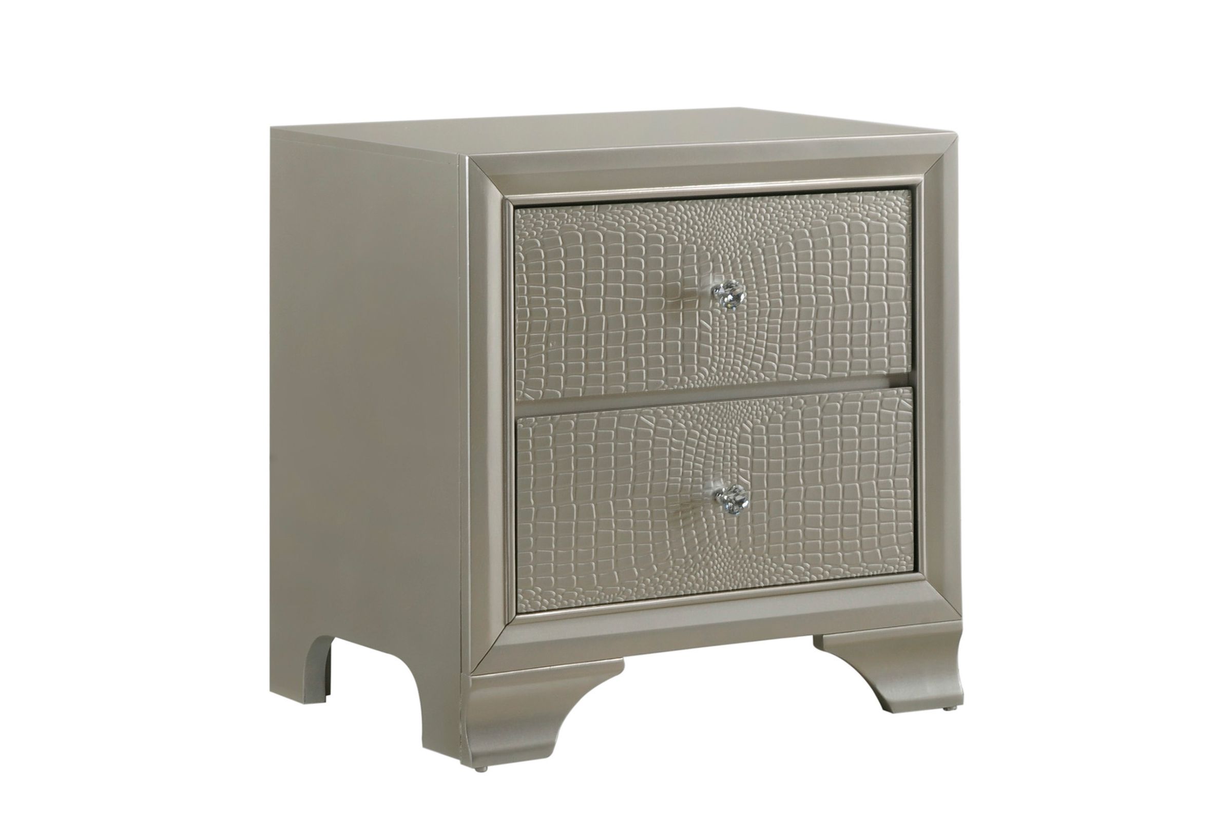 The Lyssa Nightstand has a style that is decidedly fabulous. This piece has rubberwood French dovetail drawer fronts and an English dovetail back that provides strong construction for everyday use. The modern champagne faux finish with embossed crocodile pattern come together to complete the look.