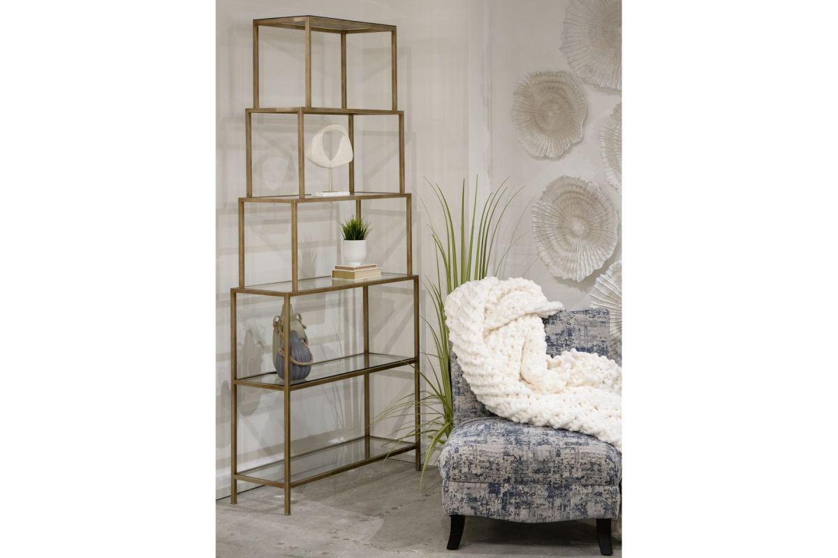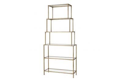 The Louisville Bookshelf is an etagere style shelving unit with glass shelves and a brushed gold metal frame. Upper shelves taper gently, getting smaller as it extends up. This is a chic and versatile piece for a bedroom or living room.