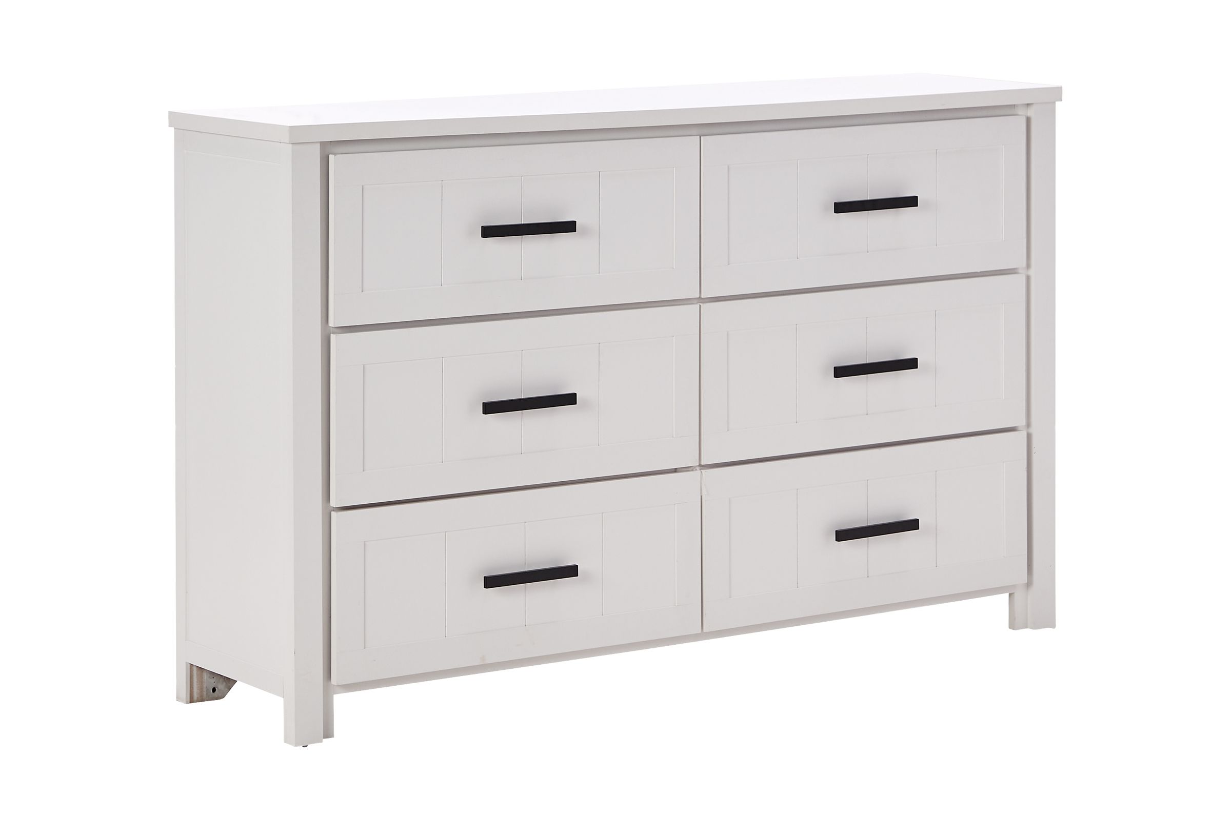 The Grace 6-drawer dresser in white is The perfect addition to your bedroom. exposed wood grain detailing and fashioned with rustic-inspired distressing for character. Features six drawers and dust proofing at bottom drawer for protecting your clothing from dust. "Dresser only No Mirror"