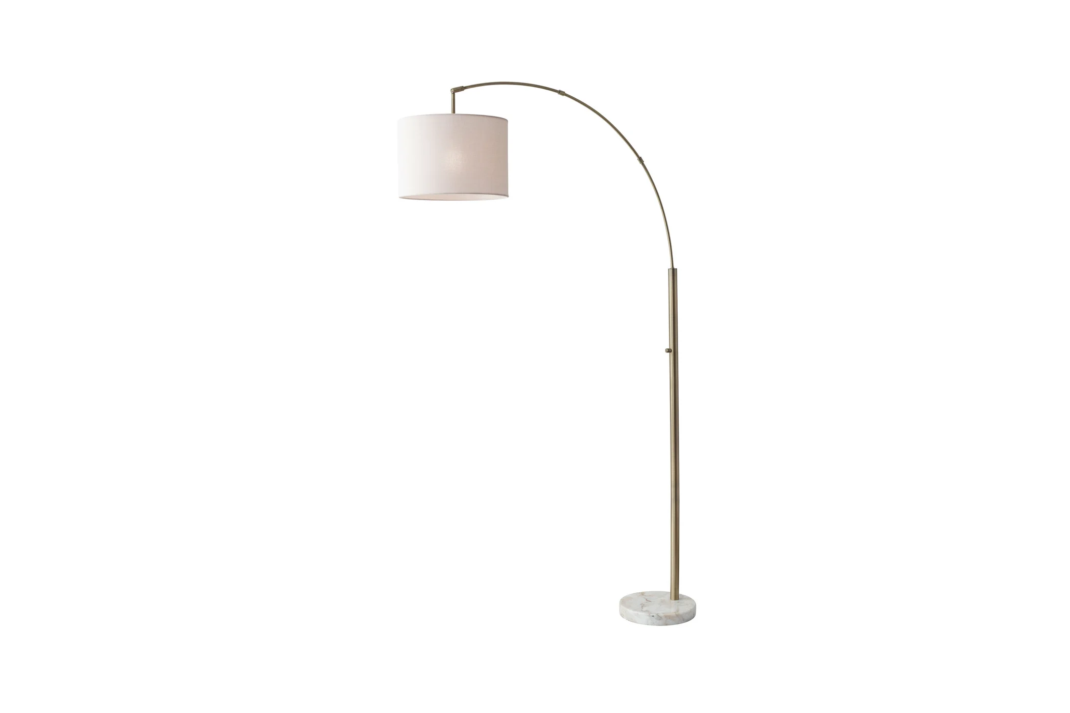 A smart and stylish way to light up a seating area, the Bowery Arc Lamp provides overhead lighting that can be controlled with an adjustable shade. Aside from functional assets, an antique brass finish is paired with a white marble base to display striking style. An 100 Watt bulb shines beautifully through an off-white textured fabric shade. An on/off rotary switch is placed conveniently on the pole. This lamp has a clear cord and is smart outlet compatible.