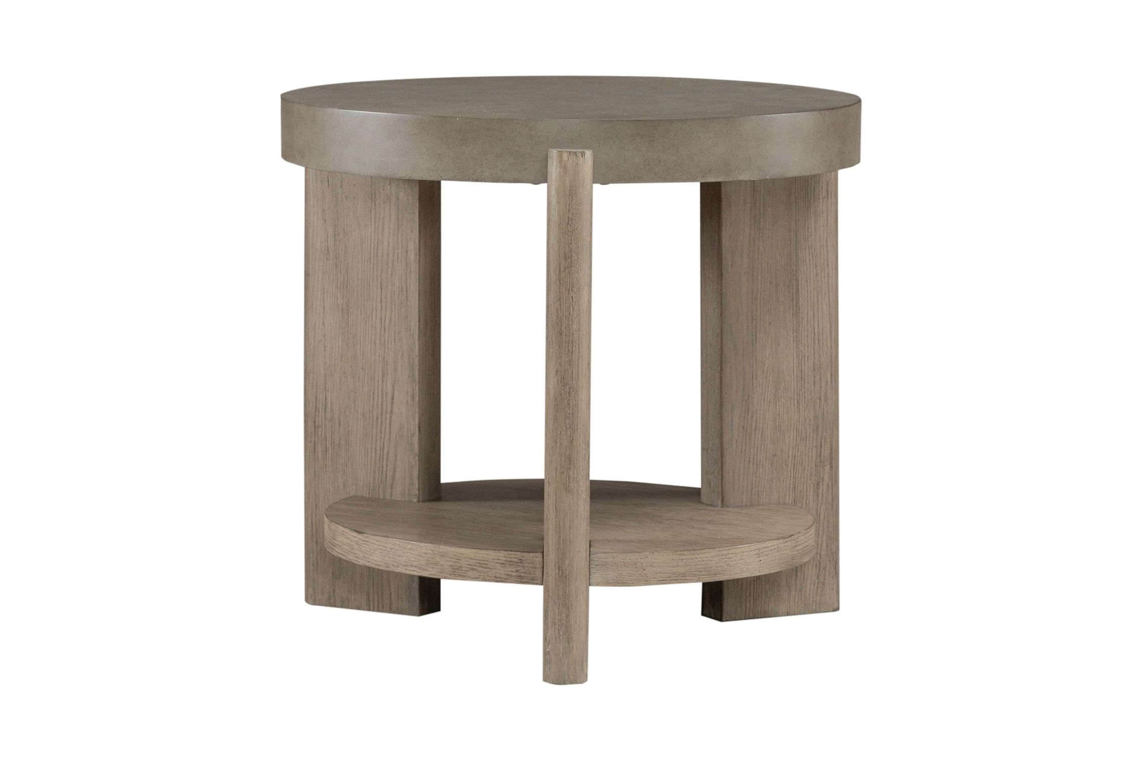 Feel at home with the Affinity round end table. Crafted with excellence using Rubberwood solids and Quartered White Oak veneers, this table features a faux concrete top and rounded oblong legs in a Dusty Taupe finish. The bottom shelf is great for additional storage. The Affinity round end table will be a true conversation piece for your living room, giving you an industrial vibe while remaining sleek and stylish.