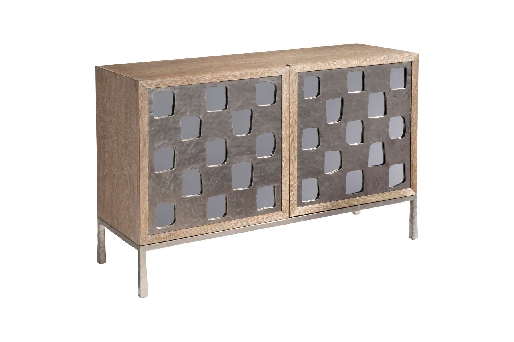 The Aventura door chest has a bright, casual sophistication thanks to a statement-making metal overlay. Showcasing geometric cutouts, the overlay allows a mirrored back to show through on two push-to-open, soft-close doors. The doors each conceal one adjustable shelf.