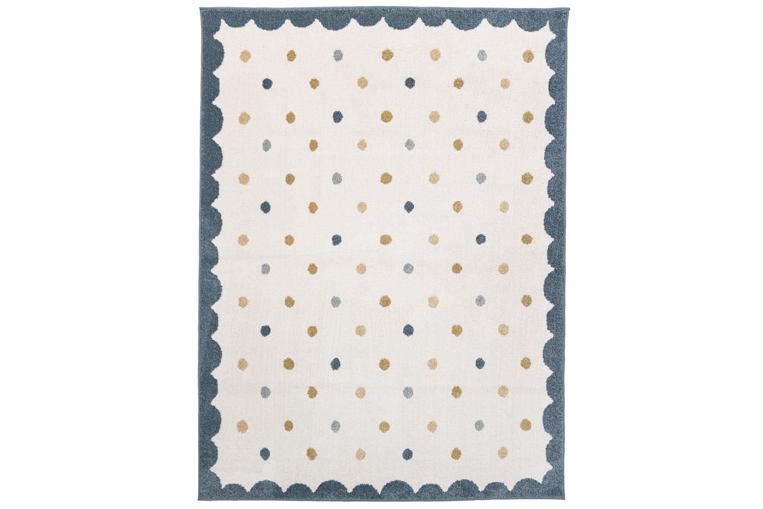 Add a playful yet refined touch to your space with this charming patterned rug. Featuring a soft ivory base accented with scattered polka dots in warm neutral tones and muted blues, this design brings subtle visual interest without overwhelming the room. The scalloped blue border frames the rug beautifully, adding a touch of whimsy and a polished, finished look.