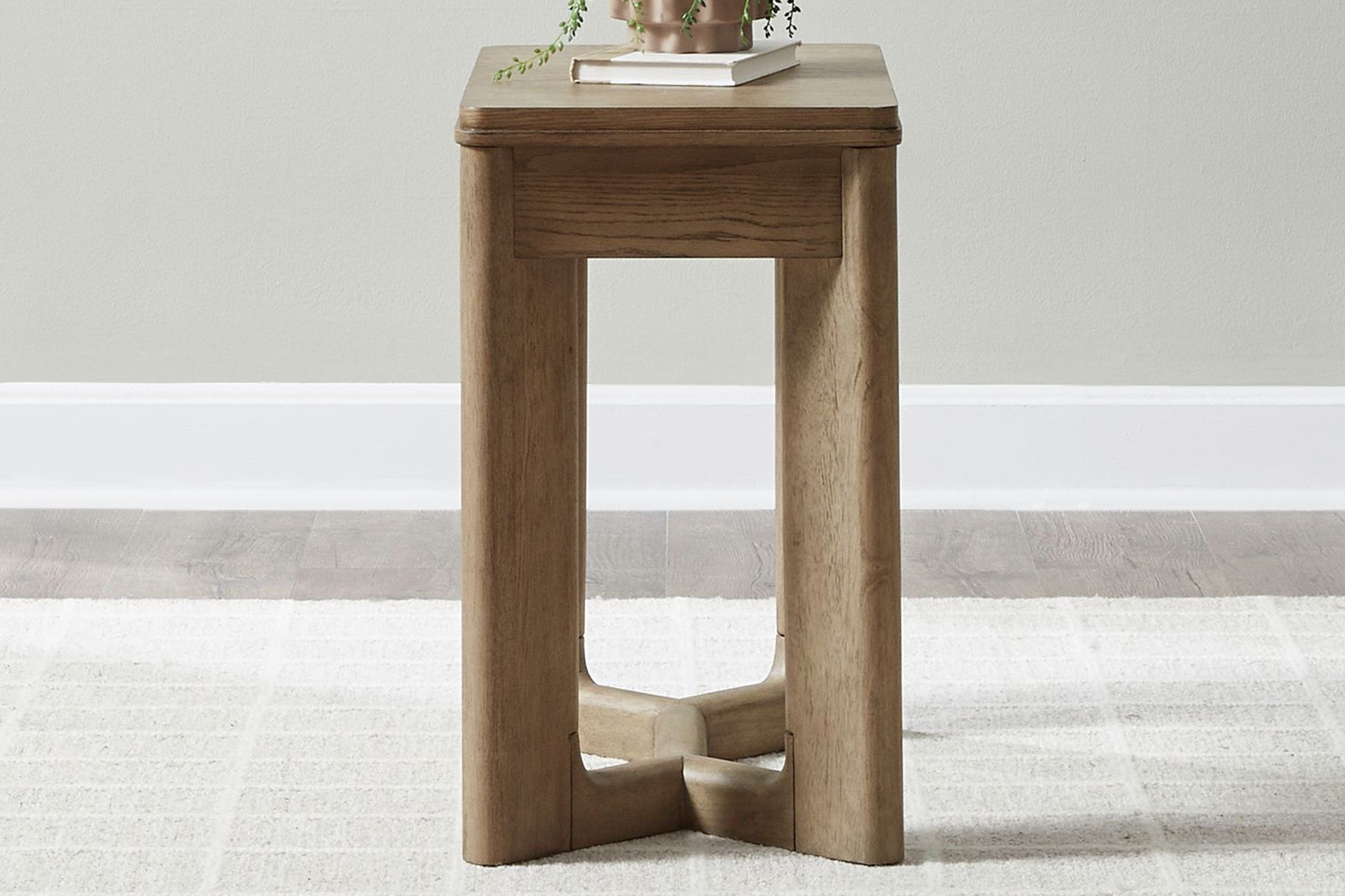 The Ballentine chairside table is a masterpiece of design that transforms your living space into an oasis of style and functionality. Crafted with excellence using Rubberwood solids and Quartered Cut White Oak veneers, this piece features a Weathered Bronze finish. The softly rounded oblong legs create a sense of elegance and continuity, flowing seamlessly to a uniquely shaped center trestle. This distinctive design element adds an artistic touch. Add a sense of style to your living space with the Ballentine chairside table.