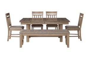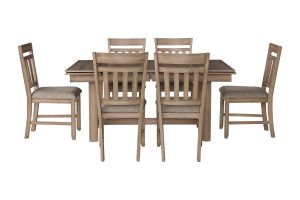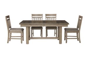 The Lakeside Collection is Crafted of Solid Rubberwood, Manufactured Woods and Oak Veneers, this Dining Set is designed to last. The rich Walnut Brown color is achieved through a multi-step process that include burnishing and glazing to bring out the natural beauty of the wood grain. The traditional trestle base features a solid, pillared base that complements the slat-backed dining chairs. The design blends elements of farmhouse, mission, and arts and crafts styles.