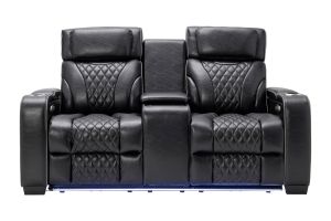 Elevate your living room or home theater with the Zodiac Dual Power Reclining Living Room Collection, where bold design meets ultimate comfort and modern tech. Upholstered in a sleek black with striking diamond-quilted detailing, each piece features dual power reclining functionality that lets you adjust the headrest and footrest independently for a truly customized lounging experience. The reclining sofa includes a hidden drop-down table with built-in cupholders, perfect for movie nights or multitasking in comfort. The console loveseat adds extra convenience with a storage console, cupholders, and easy access to your essentials. Rounding out the collection, the power recliner delivers the same plush comfort and advanced reclining control in a single-seat format. All three pieces are enhanced with LED lighting along the front and sides, adding ambient glow and a contemporary edge to your space. Designed for style, built for relaxation—the Zodiac collection transforms your living room into a luxurious entertainment zone.