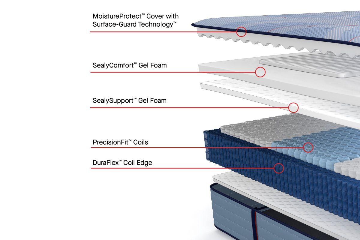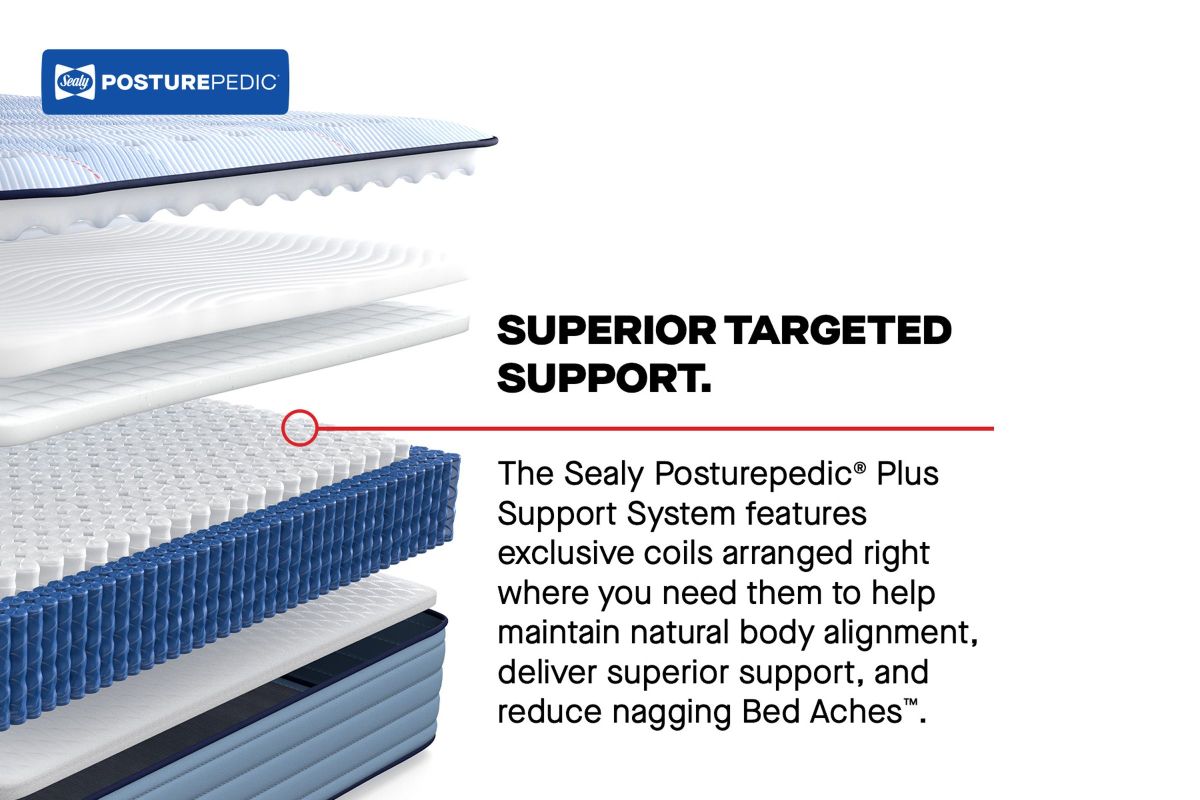 The Sealy Posturepedic® Plus Spring Medium mattress delivers pressure-relieving comfort to help maintain natural body alignment and reduce nagging Bed Aches™ night after night. The orthopedic-inspired Posturepedic® Plus Support System features exclusive PrecisionFit™ Coils, arranged right where you need them. Plus, the DuraFlex™ Coil Edge provides a reinforced solid surface that’s built to last.