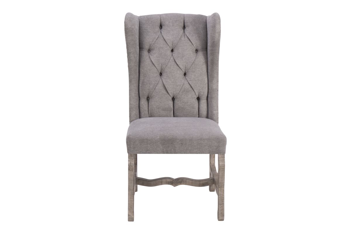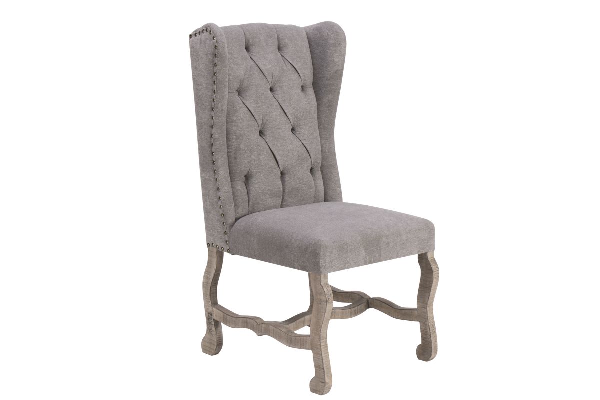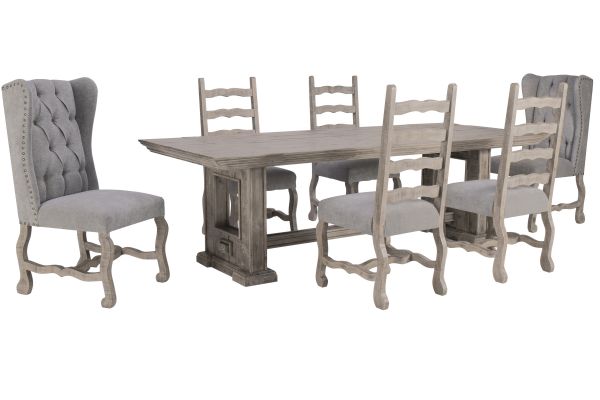 The Wimberly Collection stands out on its own. The stately architectural design elements of the crown molding and trestle base make this table a statement piece in your home. The chairs feature gorgeous carved wood legs that are accented by soft grey linen upholstered seats with individual nail head accent trim. The tufted wingback host chairs add an elegant touch.