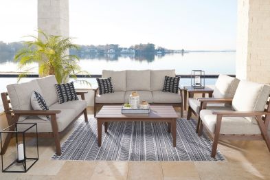 Get back to nature with the relaxed styling of the Emmeline outdoor seating package. The comfortably casual wood look lends visual appeal. Exceptional durability and weather resistance ensure season after season of enjoyment.
