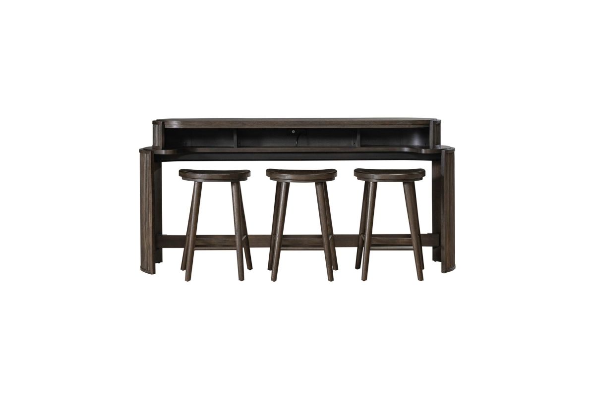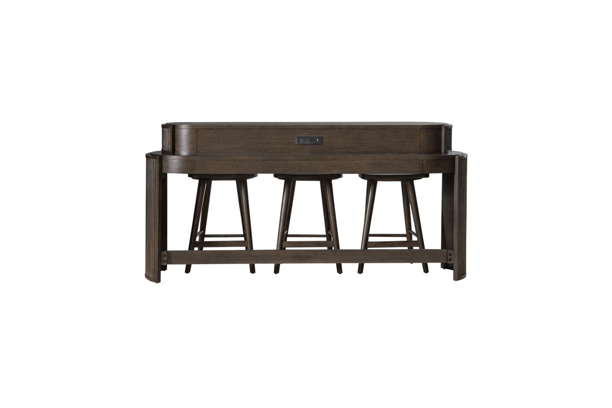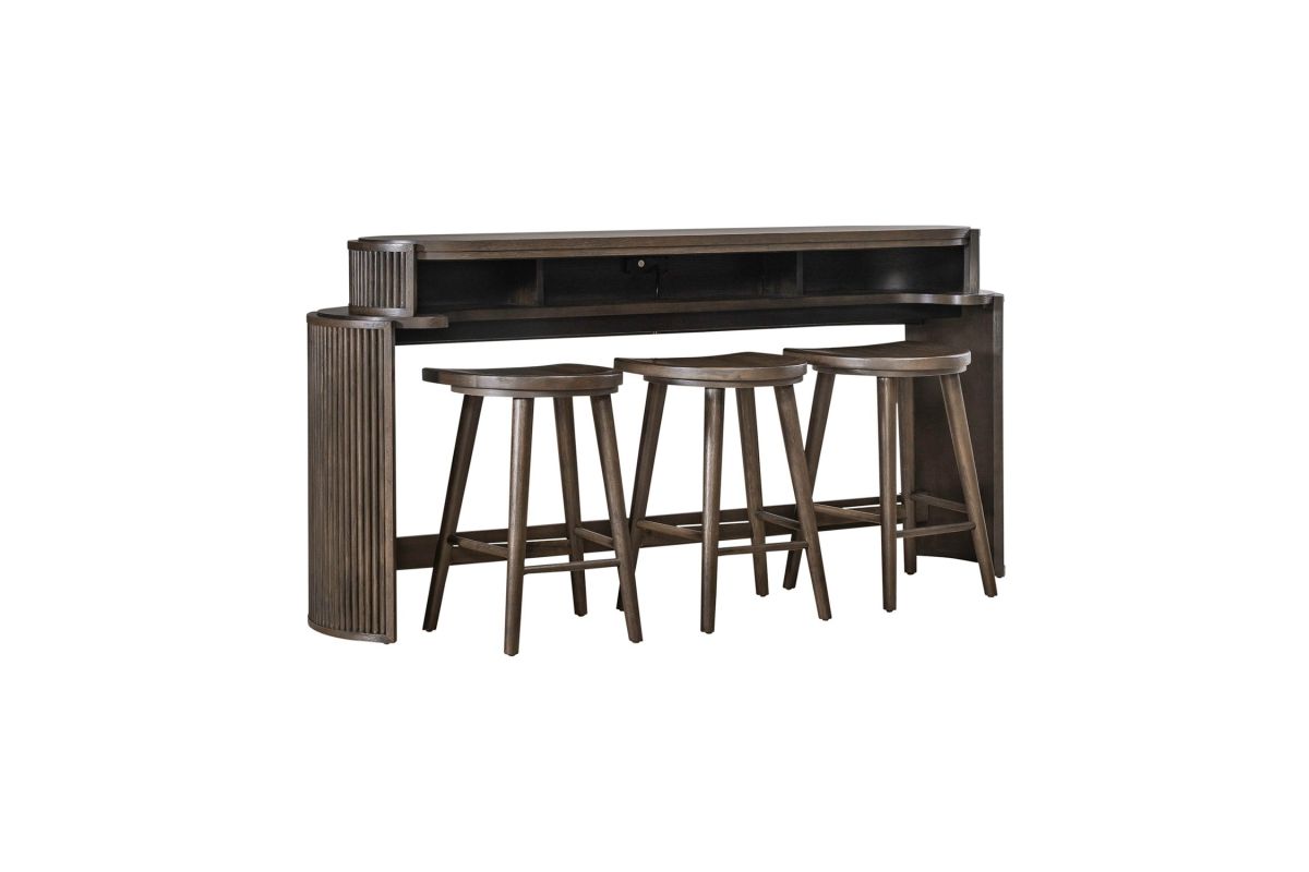 With its sleek lines and modern design, the City View 4 piece set is a statement of impeccable taste and refined sophistication. Crafted with excellence using Rubberwood solids and Quartered White Oak veneers, this set features a Coffee Bean finish and includes the console bar table and 3 console stools. At the heart of the console bar table lies its modern silhouette, characterized by softly curved reeded end panels that exude elegance and refinement. These subtle details lend a sense of texture and visual interest to the table, creating a focal point that effortlessly complements any interior aesthetic. But it's the practical features that truly set this console bar table apart. Small storage compartments underneath the top provide the perfect spot to store remote controls, keeping them within easy reach yet neatly organized. But the true genius of this table lies in its built-in charging station, which ensures that your devices are always powered up and ready to go. With two AC outlets, one USB-A port, and one USB-C port, you can charge multiple devices simultaneously, whether it's your smartphone, tablet, or laptop. The scooped wooden seat of the console stools, and the round tapered legs that flow to the footrest for added comfort, provide ergonomic support for long periods of sitting. Perfect for placing behind the sofa, the City View 4 piece set transforms any seating area into a multifunctional space where you can enjoy a meal, catch up on work, or simply unwind while watching your favorite TV show or movie. Its sleek design and practical features make it an indispensable addition to any home, offering both style and convenience in equal measure.