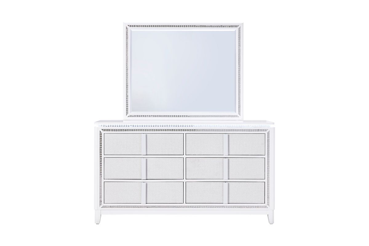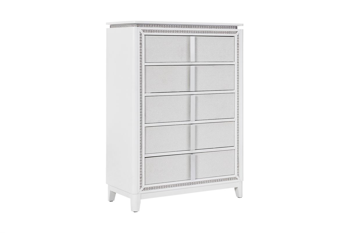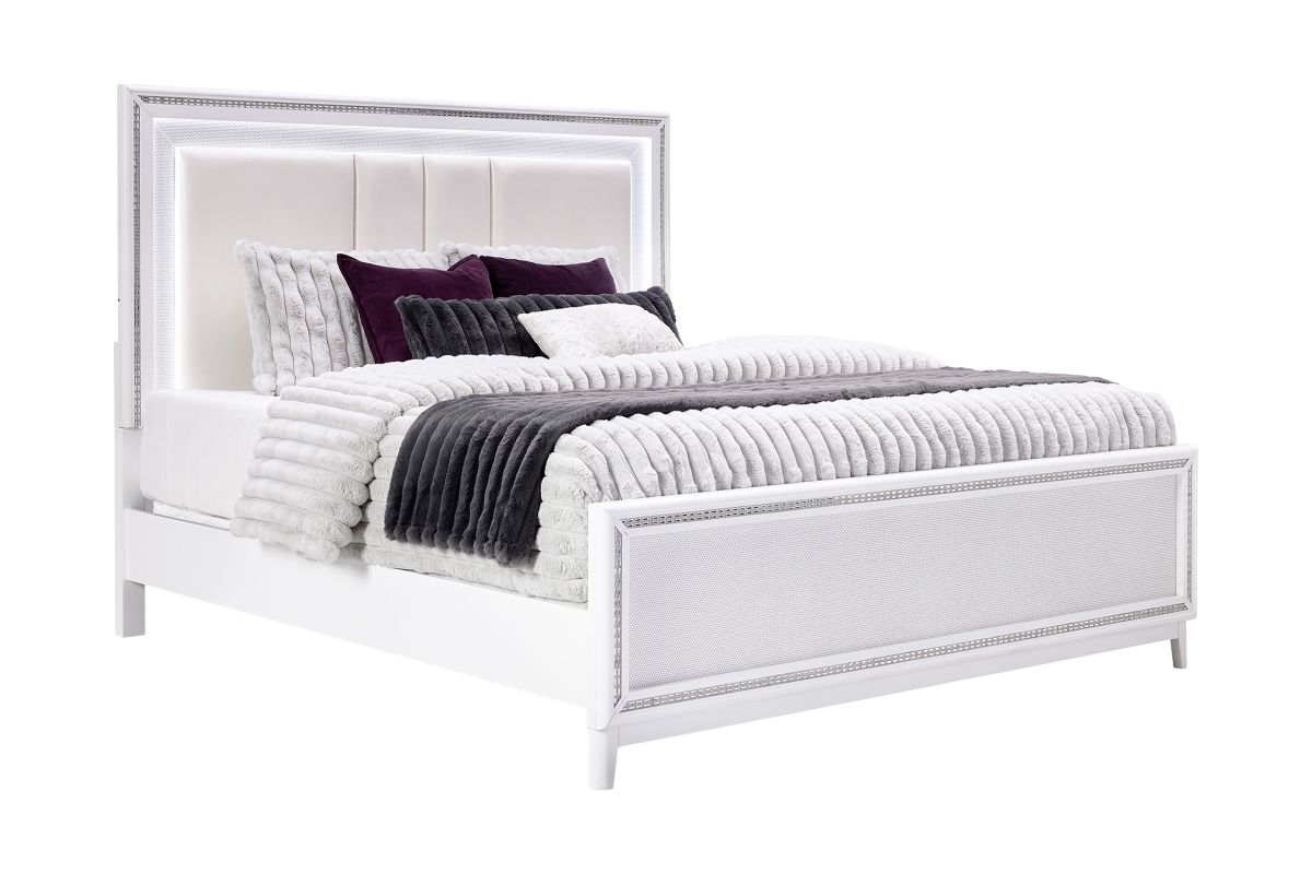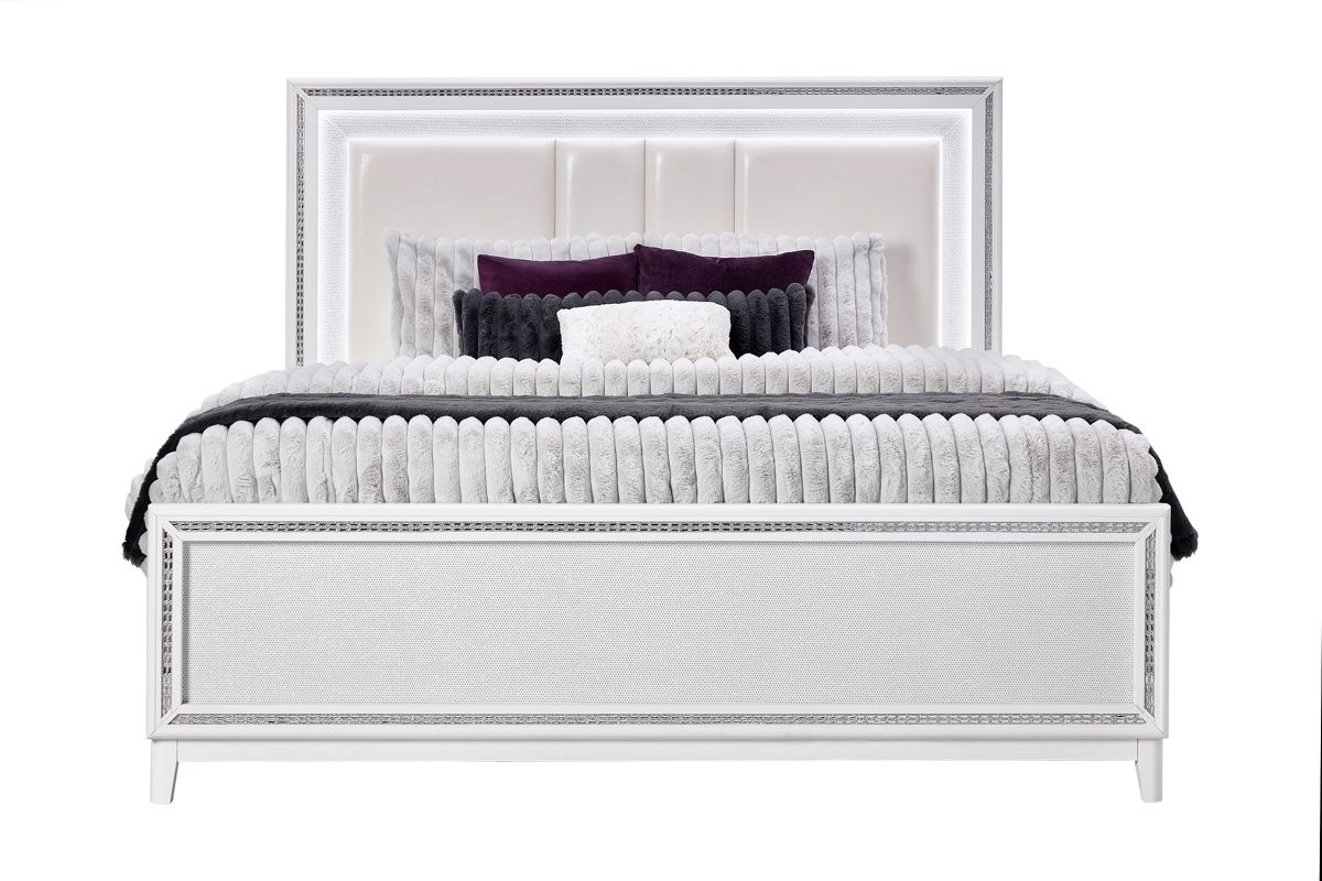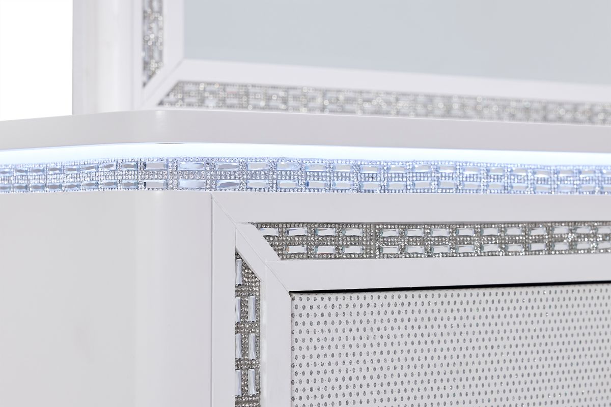 This stunning Sabrina bedroom set features a contemporary design highlighted by integrated LED lighting. The headboard, dresser, chest, and nightstand all include sleek LED accents, adding a touch of glamour and functionality to the room. The LED lights provide a soft, ambient glow that enhances the modern aesthetic while offering convenient illumination.