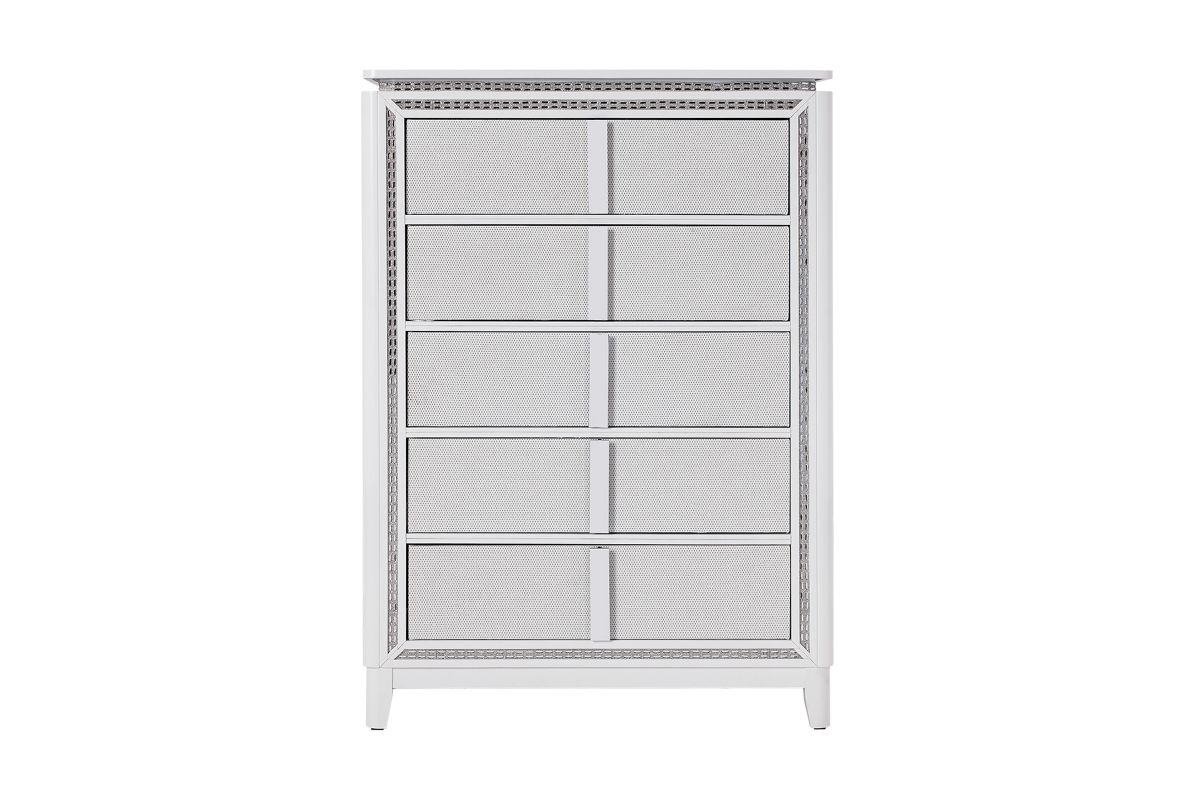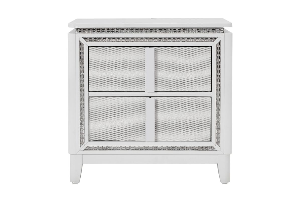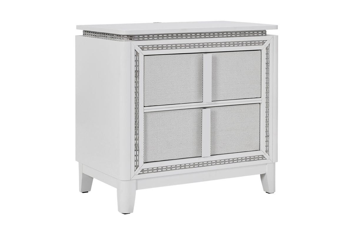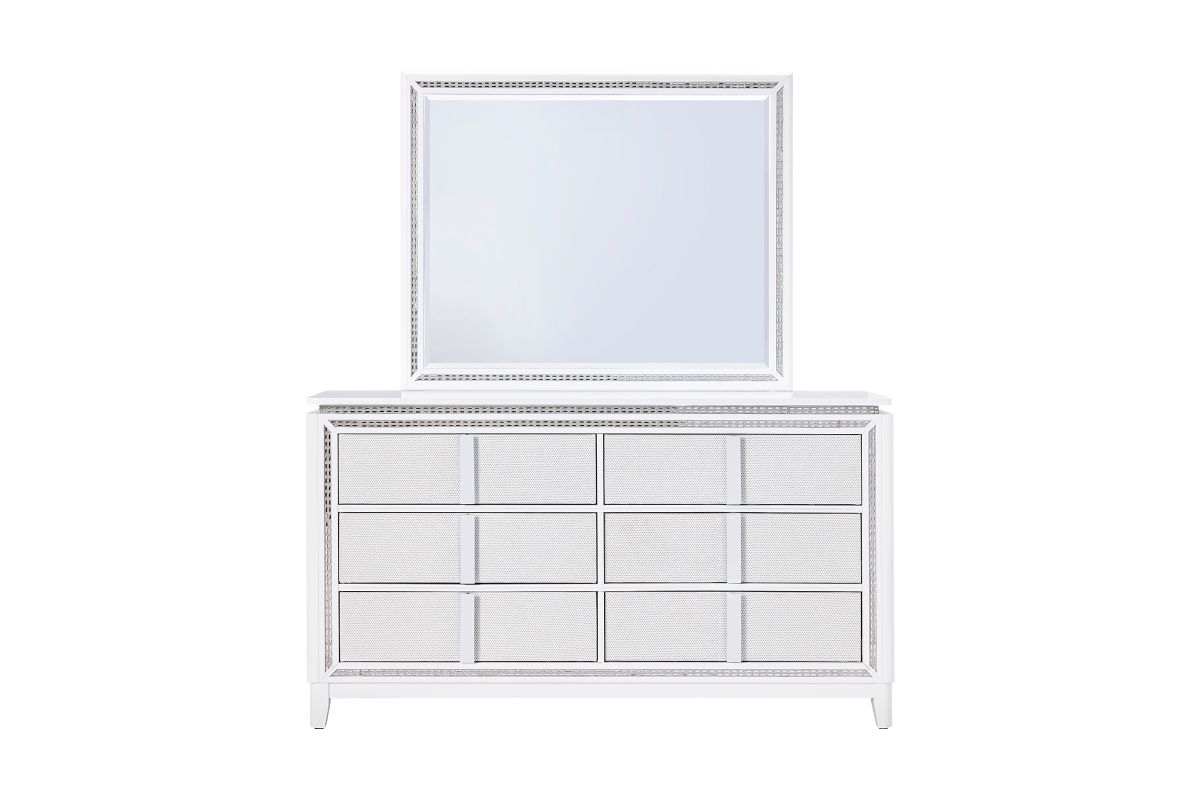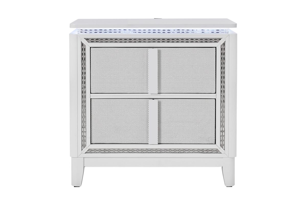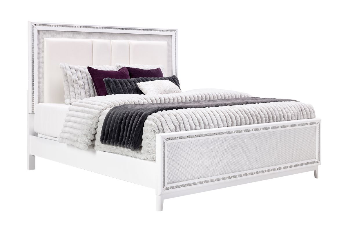 This stunning Sabrina bedroom set features a contemporary design highlighted by integrated LED lighting. The headboard, dresser, chest, and nightstand all include sleek LED accents, adding a touch of glamour and functionality to the room. The LED lights provide a soft, ambient glow that enhances the modern aesthetic while offering convenient illumination.