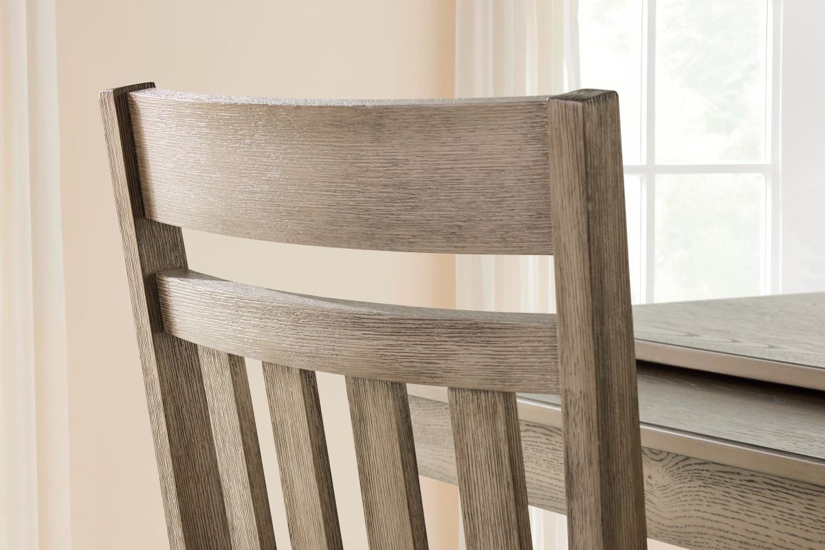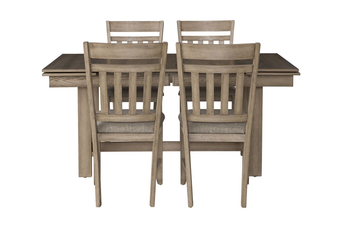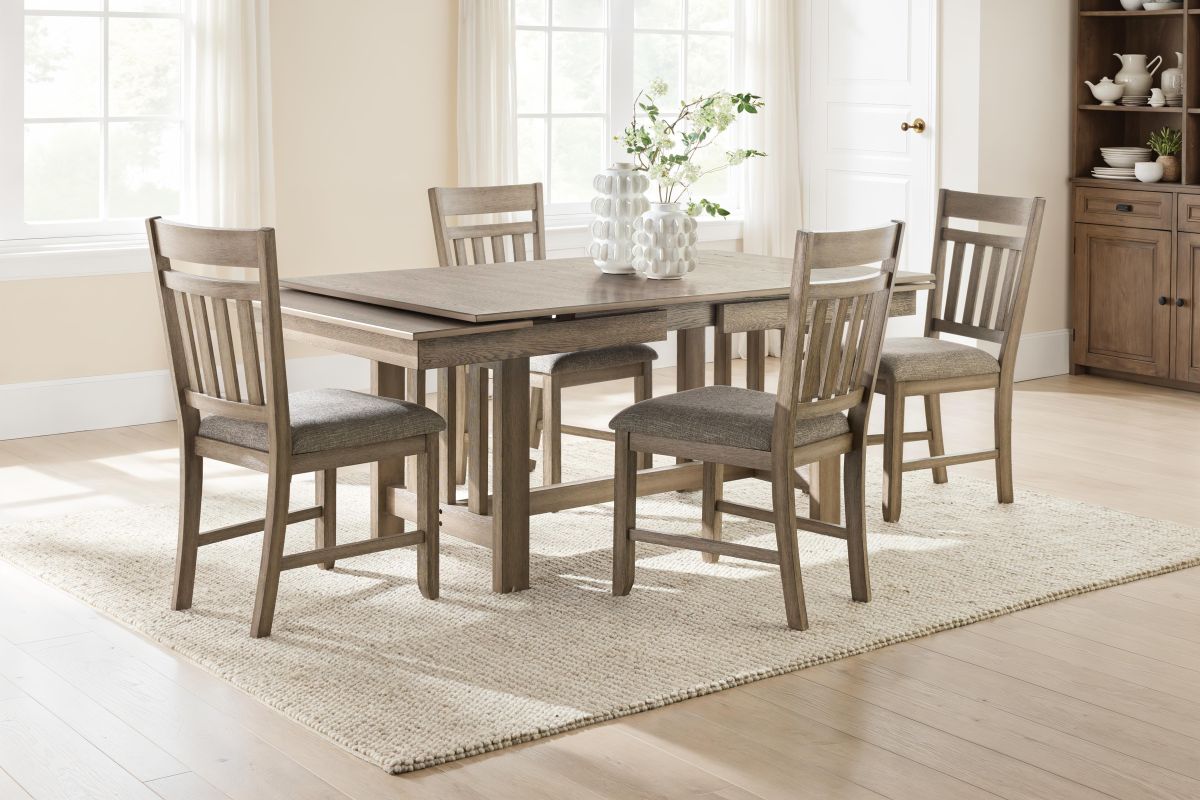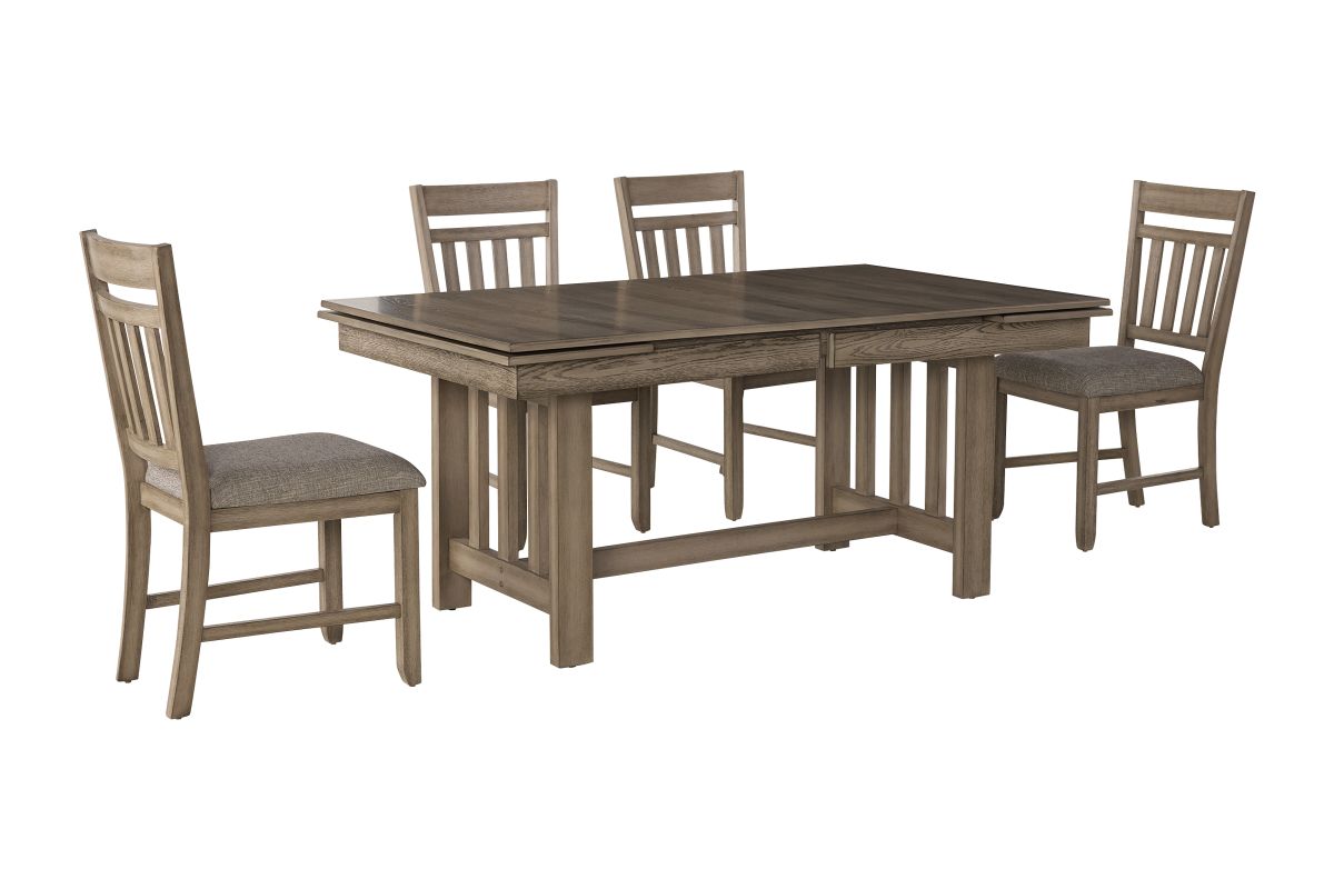 The Lakeside Collection is Crafted of Solid Rubberwood, Manufactured Woods and Oak Veneers, this Dining Set is designed to last. The rich Walnut Brown color is achieved through a multi-step process that include burnishing and glazing to bring out the natural beauty of the wood grain. The traditional trestle base features a solid, pillared base that complements the slat-backed dining chairs. The design blends elements of farmhouse, mission, and arts and crafts styles.