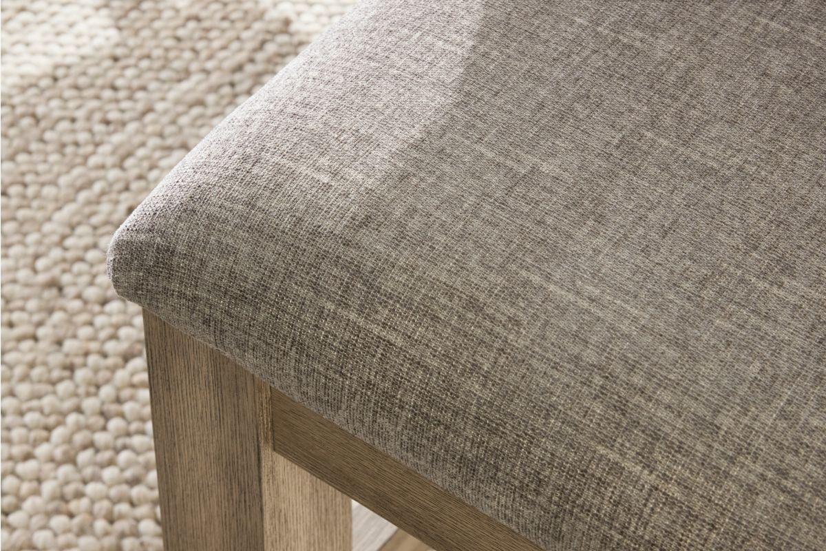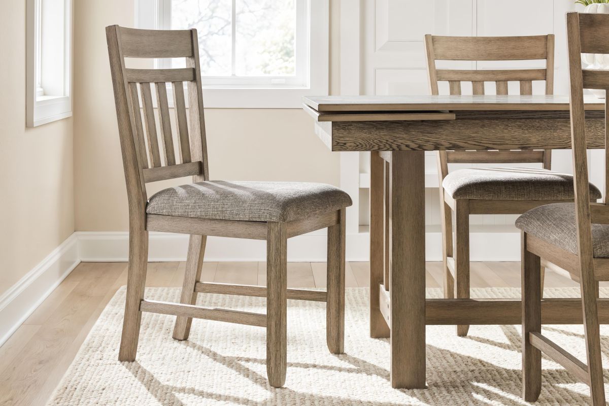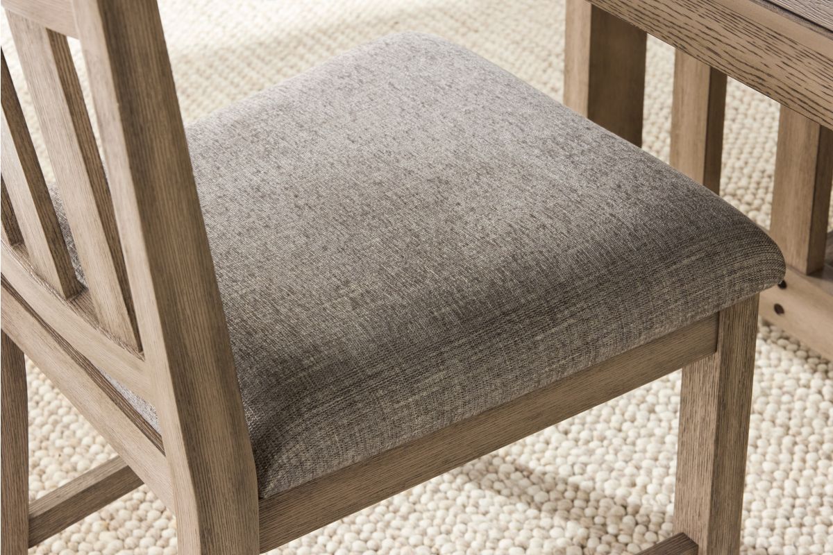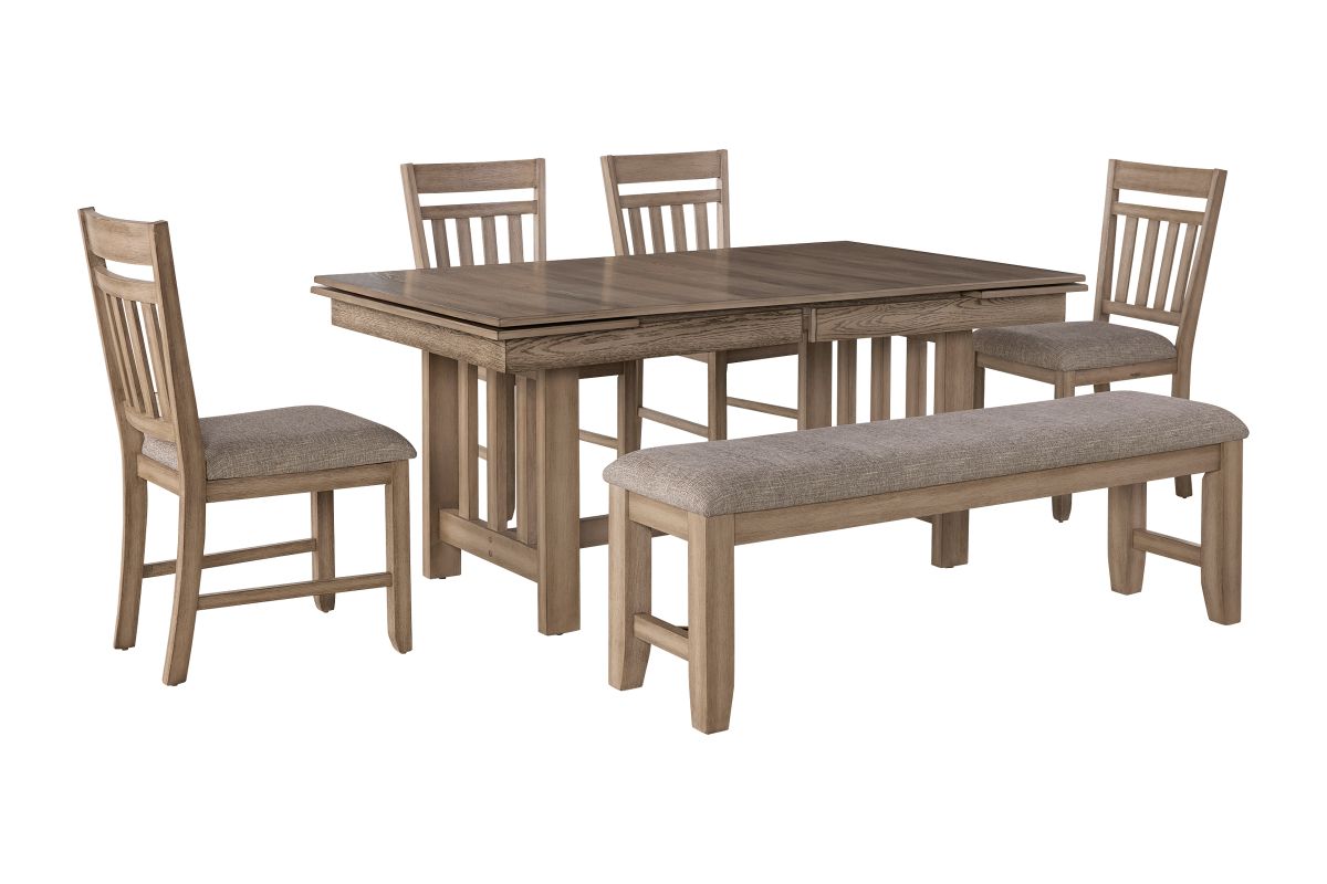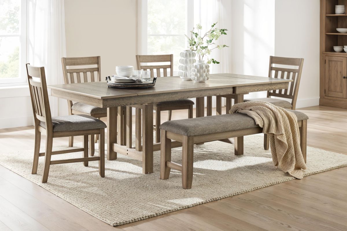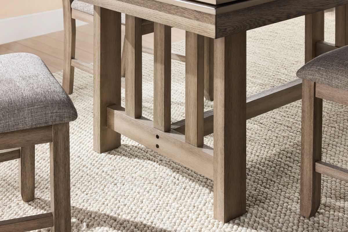 The Lakeside Collection is Crafted of Solid Rubberwood, Manufactured Woods and Oak Veneers, this Dining Set is designed to last. The rich Walnut Brown color is achieved through a multi-step process that include burnishing and glazing to bring out the natural beauty of the wood grain. The traditional trestle base features a solid, pillared base that complements the slat-backed dining chairs. The design blends elements of farmhouse, mission, and arts and crafts styles.