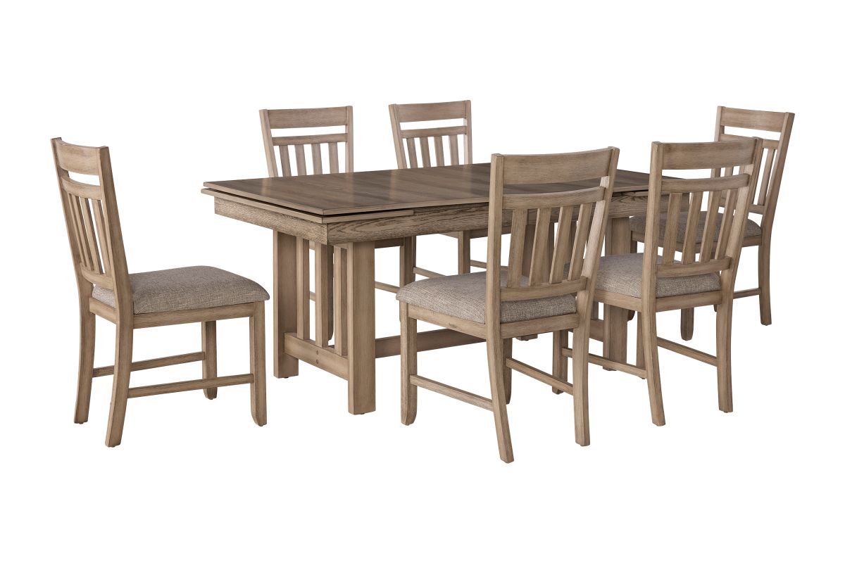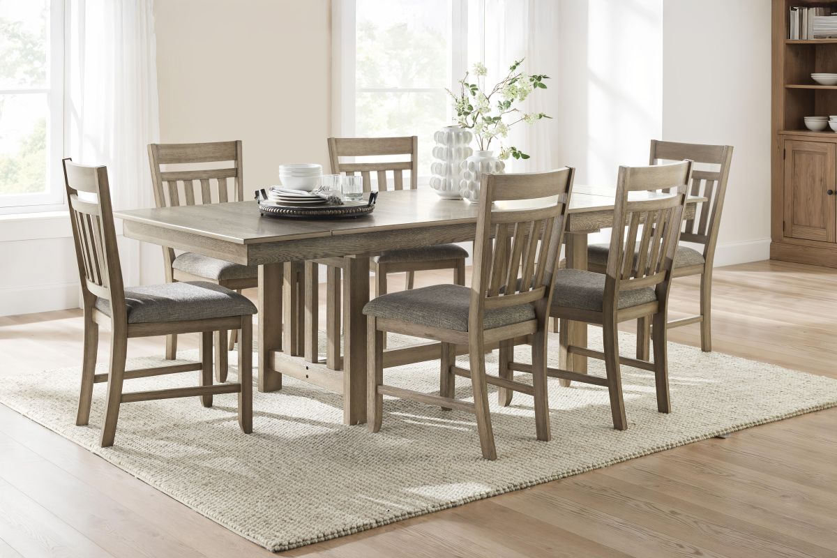 The Lakeside Collection is Crafted of Solid Rubberwood, Manufactured Woods and Oak Veneers, this Dining Set is designed to last. The rich Walnut Brown color is achieved through a multi-step process that include burnishing and glazing to bring out the natural beauty of the wood grain. The traditional trestle base features a solid, pillared base that complements the slat-backed dining chairs. The design blends elements of farmhouse, mission, and arts and crafts styles.