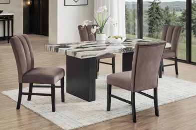 This bold and contemporary dining group features a dramatic marble-look tabletop with dynamic veining that mimics natural stone, adding an upscale, artistic touch to any dining space. The sculptural black pedestal base complements the striking tabletop, creating a luxurious edge perfect for elevating everyday meals and stylish entertaining. Paired with sleek, channel-tufted chairs