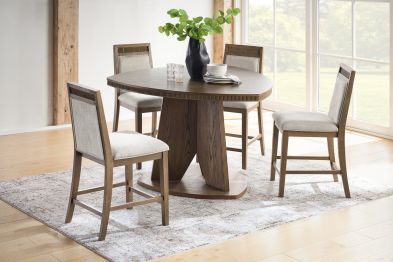 The Verve 5-Piece Dining will be the centerpiece of your dining room, our triangle wooden table boasts a unique central pedestal base. Its visible wood grain texture adds a touch of natural elegance, and sink into plush comfort with our padded Stools. The light fabric upholstery complements the warm tones of the wood, creating a harmonious look.