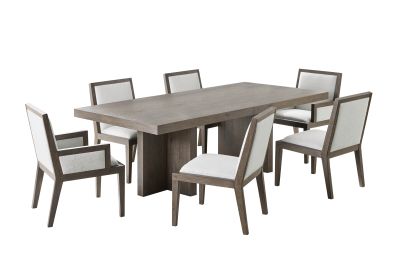 Showcasing the hallmarks of Arts and Crafts style, the Outline dining table takes simple shapes and fashions them into a bold organic statement. Rectilinear panels connect for a angled base that supports the bold top. Deeply textured wood is finished in Cassel. The Outline chair defines a modernist style with an exposed wood frame that contrasts with upholstered panels. The textural Cassel wood finish offers a casual accent to the sophisticated design with a livable approach.