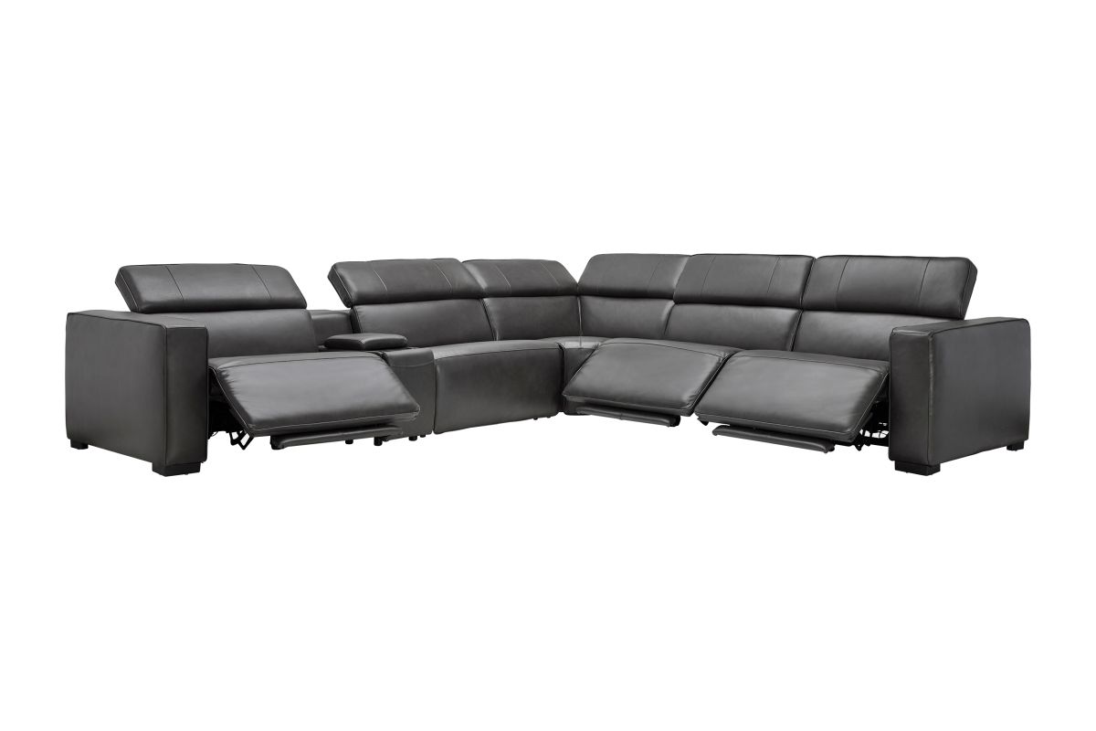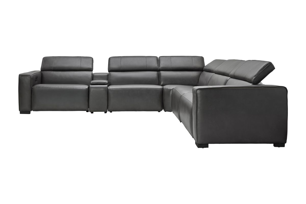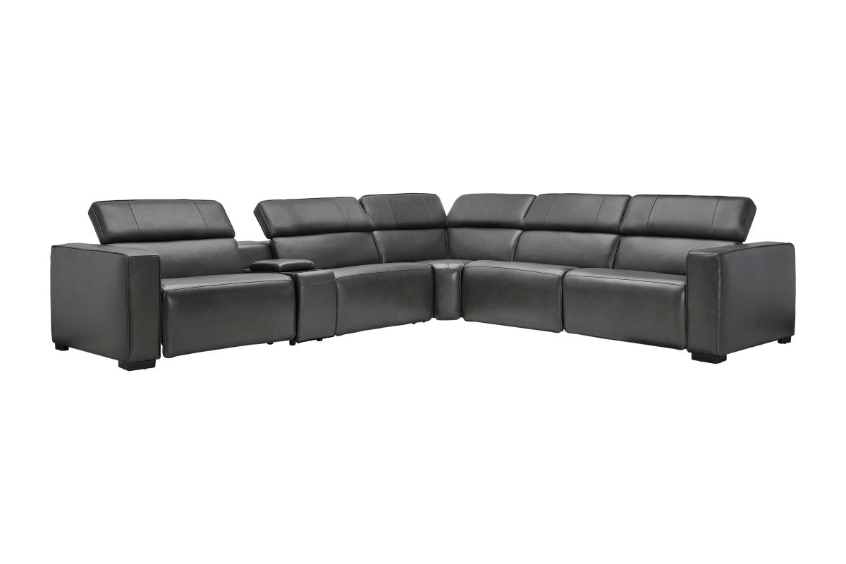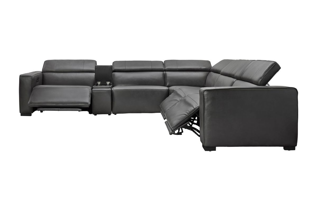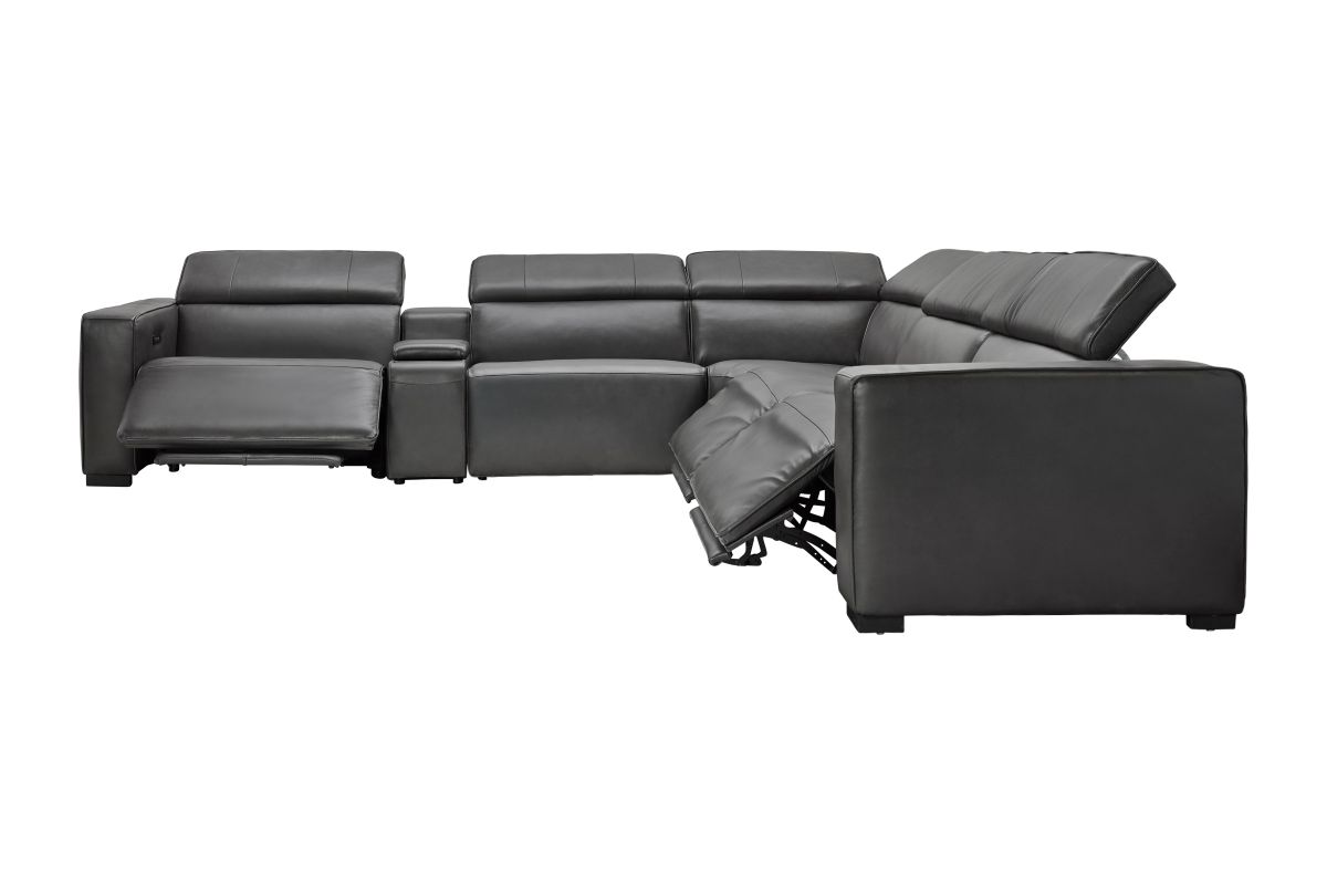 The Drift Grey Leather Dual Power Reclining 6-Piece Sectional is designed to be the ultimate gathering spot, blending sleek contemporary style with state-of-the-art comfort features. Upholstered in a versatile grey finish, this spacious sectional offers plenty of room for family and friends while surrounding you with innovative technology. Each seat features dual power reclining with adjustable power headrests, allowing everyone to find their perfect position at the touch of a button.