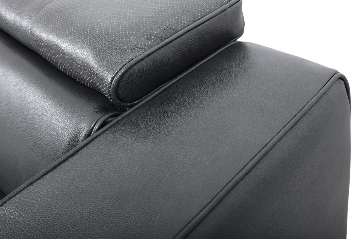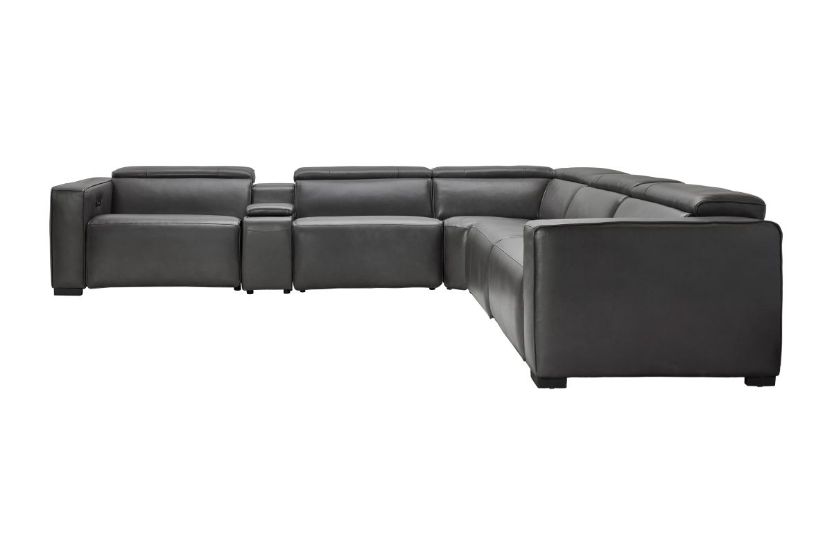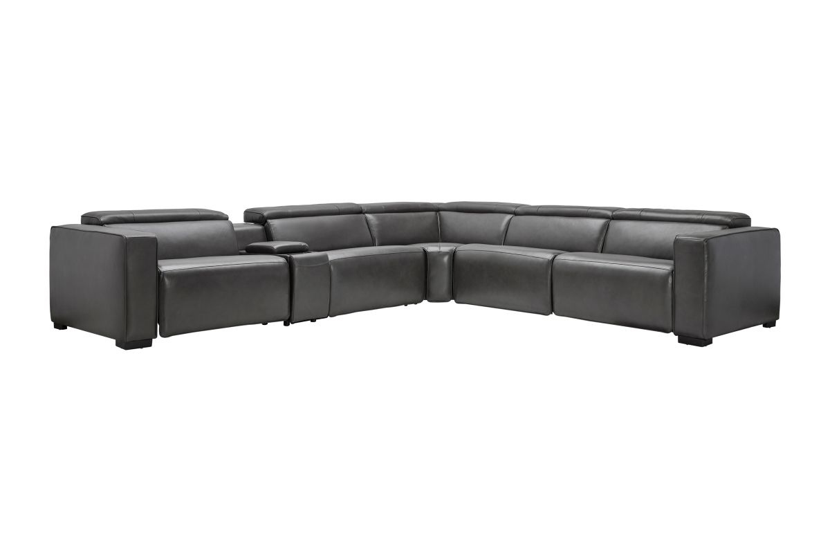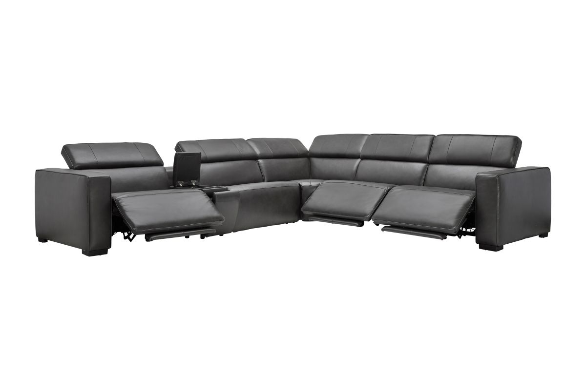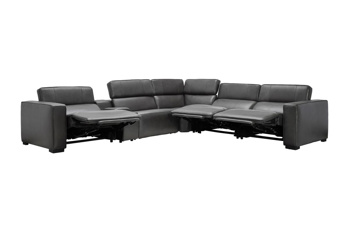 The Drift Grey Leather Dual Power Reclining 6-Piece Sectional is designed to be the ultimate gathering spot, blending sleek contemporary style with state-of-the-art comfort features. Upholstered in a versatile grey finish, this spacious sectional offers plenty of room for family and friends while surrounding you with innovative technology. Each seat features dual power reclining with adjustable power headrests, allowing everyone to find their perfect position at the touch of a button.