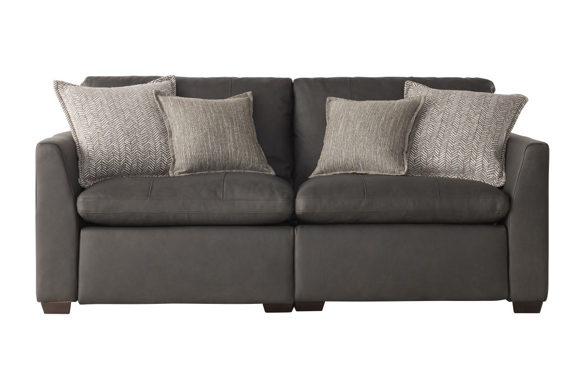 - A modular deep seating power reclining sectional that is wrapped in soft matte finished charcoal leather. The seats cushions are removable for an occasional fluffing. They are filled with high resiliency foam and feather/fiber blend. The back cushions and accent pillows also are feather/fiber blend which envelop you in luxurious comfort. There is a left and right power recliner, armless power recliner, armless chair, corner, chair ½ stand-alone recliner and a castered storage cocktail ottoman. With all of the different configurations available, you can tailor this to fit in many different sized rooms.