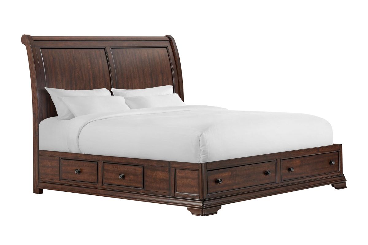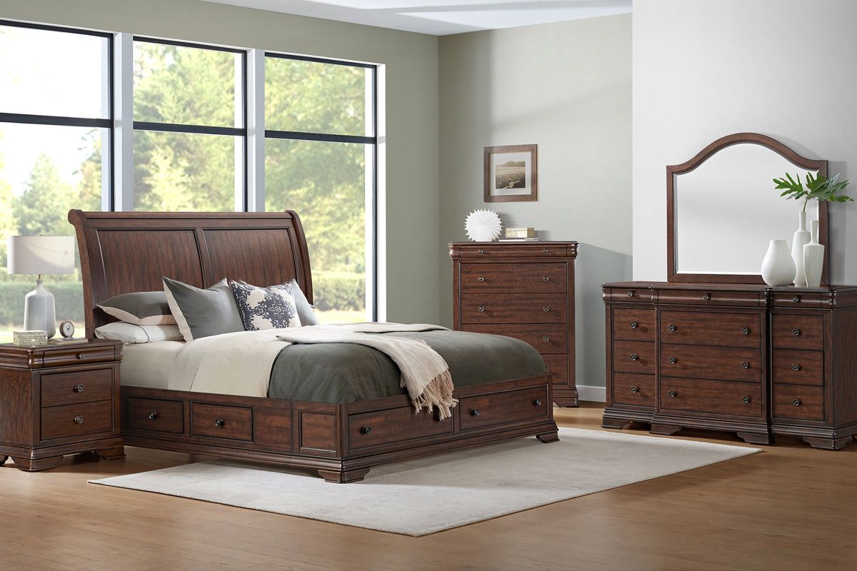 The Heritage Cherry Bedroom Set is the epitome of elegance and sophistication. With its sleek sleigh headboard,storage footboard stained drawer panels, and curved mirror, these pieces will add a touch of luxury to any bedroom. The beveled edges throughout enhance its refined look, while also offering practical features like top jewelry drawers with black felt lining to provide a safe and stylish storage solution. Crafted from fine poplar wood with a beautiful cherry finish, the Heritage Bedroom Set is a timeless collection built to last.
