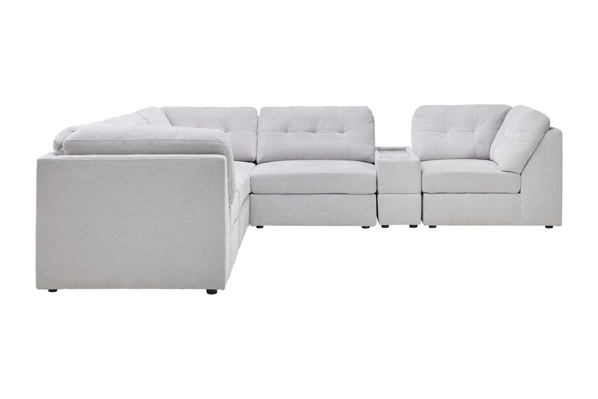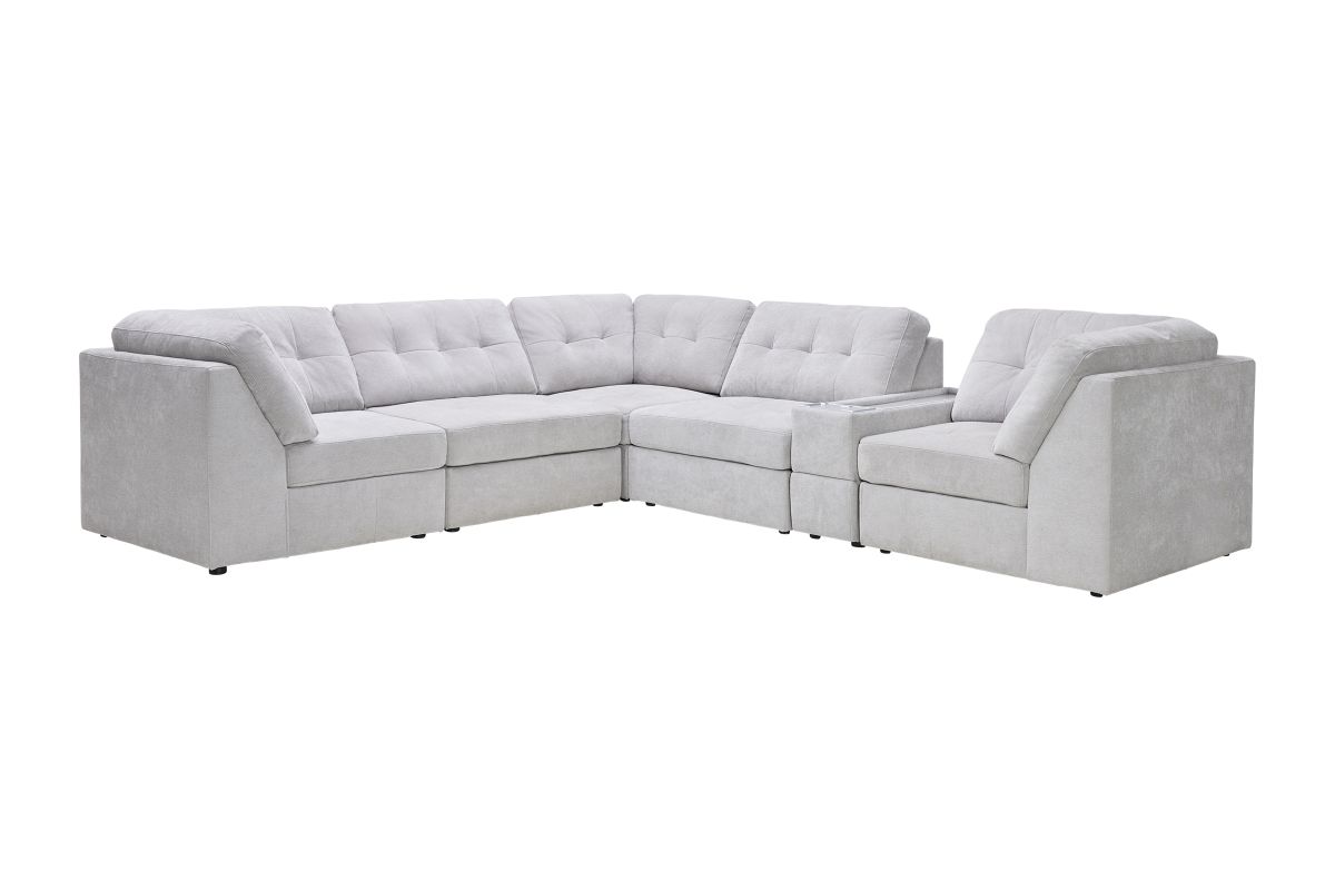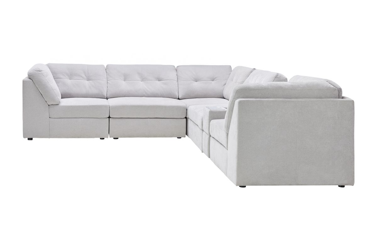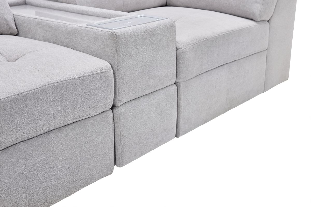 Discover the Rio Grey Sectional Collection, where modern style meets everyday comfort and technology. This modular 6-piece sectional is designed for versatility, allowing you to configure the perfect seating arrangement for your space and lifestyle. Wrapped in rich grey upholstery, it offers deep seating, plush cushions, and wide armrests for a luxurious lounging experience.