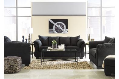 The Darcy Collection by Ashley blends contemporary flair with plush comfort. With its clean lines, stylish details, and versatile range of pieces and finishes, it’s designed to fit seamlessly into modern living spaces. Whether you're looking for a single statement sofa, a matching loveseat, or a curated set, Darcy gives you both form and function—with a touch of elegance. Set includes: Darcy Black Loveseat, Sofa, Recliner, Chair, Ottoman and the Tarrin 3-Pack Occasional Table Set.