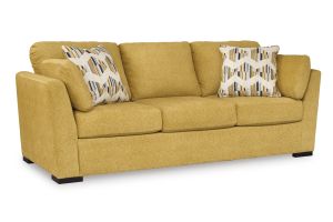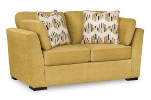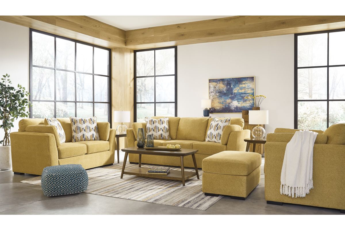 Bright and bold, this vibrant yellow‑upholstered collection radiates playful energy. Defined by rounded arms and plush cushions with textured throw pillows, it delivers both ambience and flair—perfect for spaces craving cheerful, statement-making design. Assembly required. Set includes: Keerwick Sofa, Loveseat, Oversized Char and Ottoman, Sethburn Area Rug, Tarica Table Set, and two Gierburg Ceramic Table Lamps