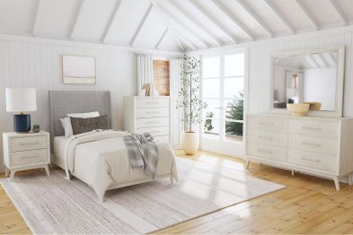 The Sydney Bedroom Set offers a blend of modern simplicity and transitional charm. Finished in a warm almond tone, this set includes a Full size bed, dresser, mirror, chest & Nightstand With clean lines, sturdy wood construction, and stylish metal hardware, it’s perfect for cozy and contemporary spaces.