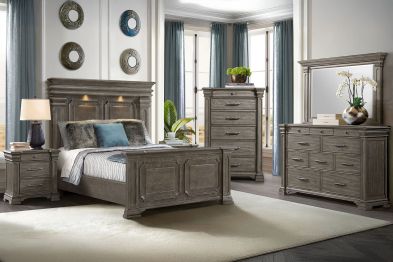 Transform your bedroom into a sophisticated sanctuary with the Radcliff 3-Piece Queen Panel Bedroom Set. This set features refined molding, giving it an elegant and timeless look. The high headboard adds a touch of grandeur to your space, while the touch-button mood-lighting in the headboard creates a relaxing ambiance. With two USB ports conveniently located in the headboard, you can easily charge your devices while lounging in bed. The black felt lined top drawers of all the case pieces provide a luxurious touch, Finished with cedar veneer bottom drawers, this set combines style and durability for long-lasting use.