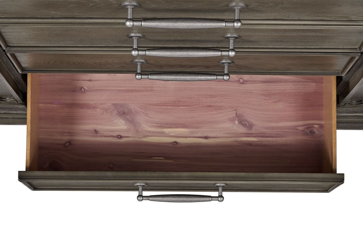 Transform your bedroom into a sophisticated sanctuary with the Radcliff King Storage Bedroom Set. This set features refined molding, giving it an elegant and timeless look. The high headboard adds a touch of grandeur to your space, while the touch-button mood-lighting in the headboard creates a relaxing ambiance. With two USB ports conveniently located in the headboard, you can easily charge your devices while lounging in bed. The black felt lined top drawers of all the case pieces provide a luxurious touch, and the nightstand sliding top with hidden storage offers safe keeping of your valuables. Finished with cedar veneer bottom drawers, this set combines style and durability for long-lasting use.