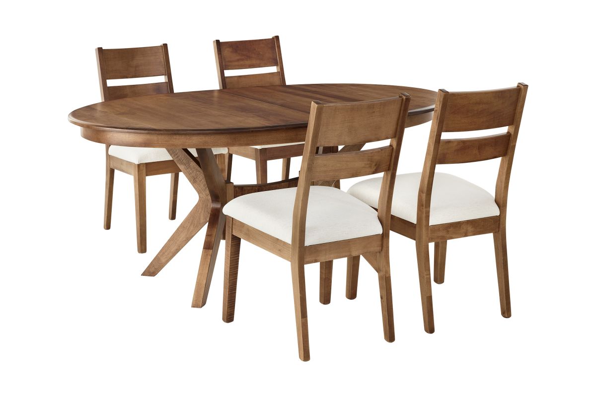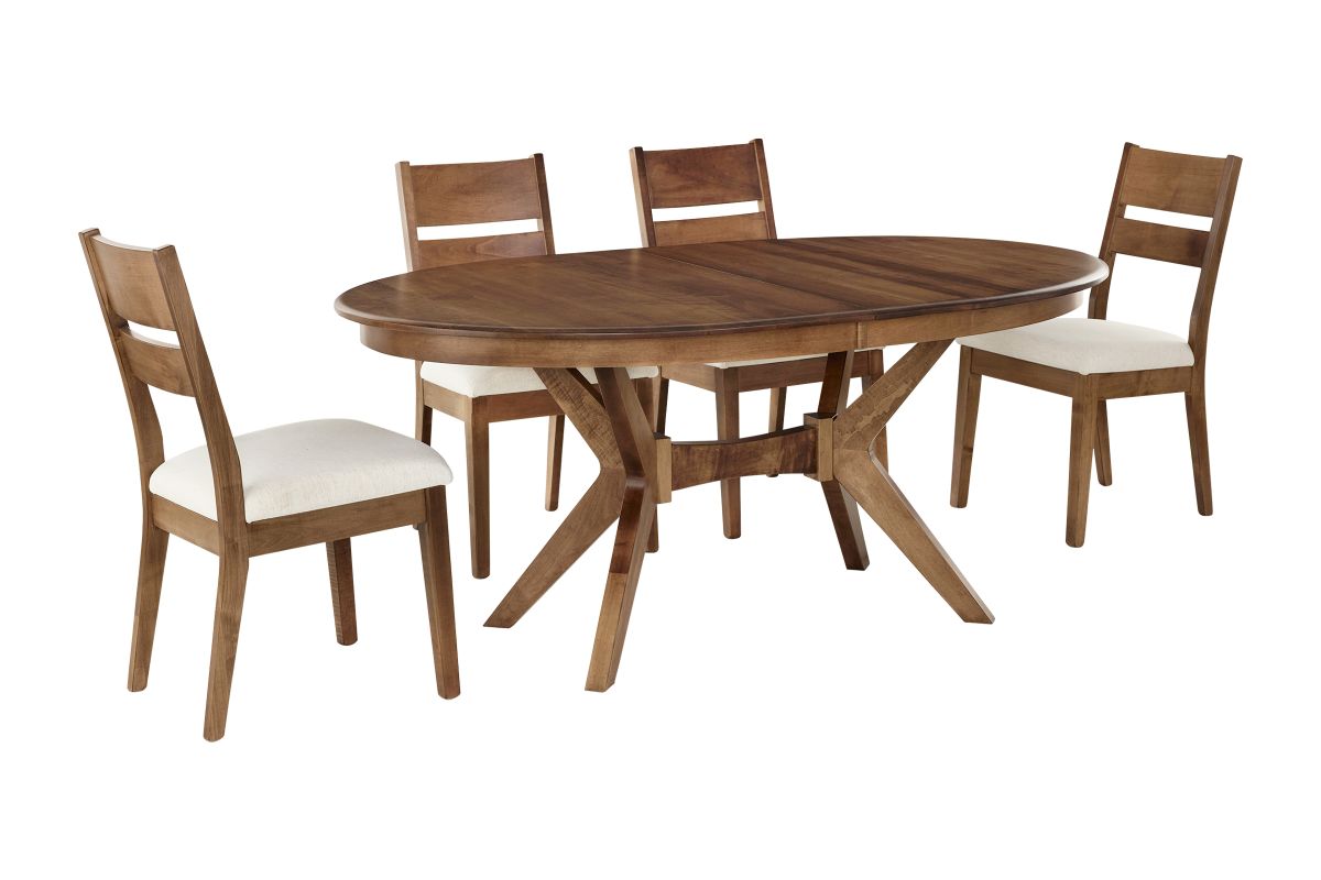 Made in Michigan & Crafted from solid hard-maple, the Paramour Dining set blends timeless elegance with lasting durability. The generously proportioned Oval top creates smooth traffic flow and allows for comfortable seating at all sides. Below, the trestle-style base offers maximum legroom and stability—no intrusive corner legs, and plenty of seating flexibility.