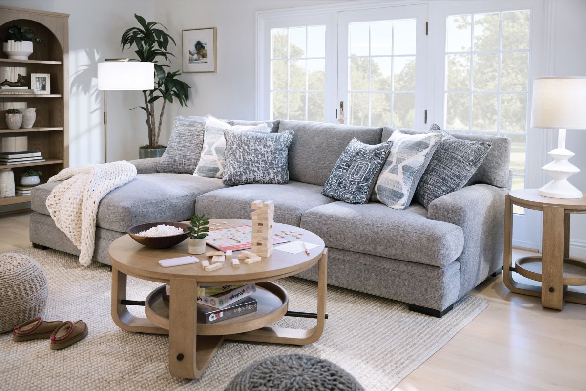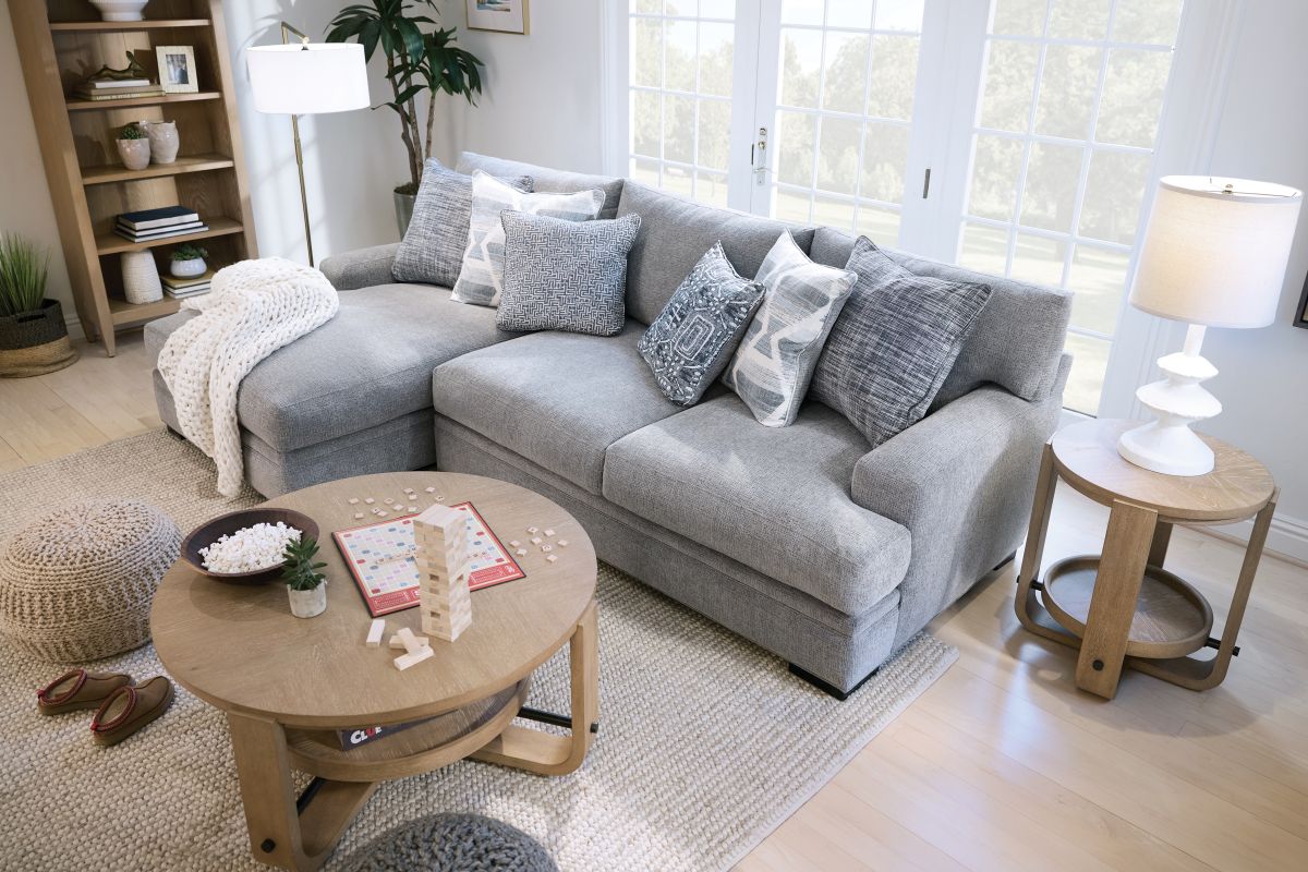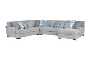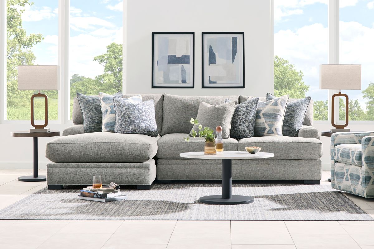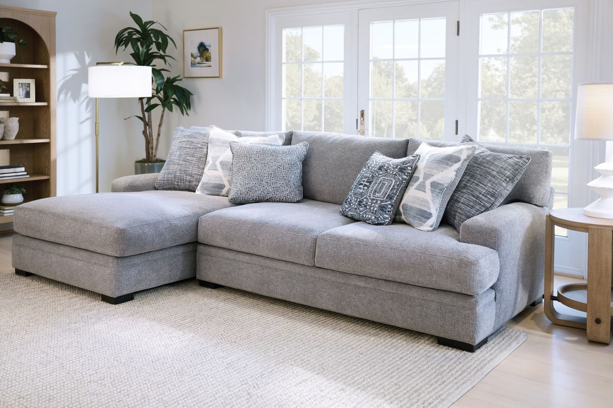 The Bulova Sectional is an ideal large-scale centerpiece for your living area, marrying contemporary charm with deep-seated comfort. The classic track arm design, enhanced by colorful toss pillows, provides a stylish and sophisticated look. Proudly crafted in the USA, this oversized seating collection accommodates the entire family comfortably. The neutral grey fabric integrates well with various color schemes, and the vibrant toss pillows offer a pop of color. Enjoy endless family movie nights on the elegant Bulova Sectional.