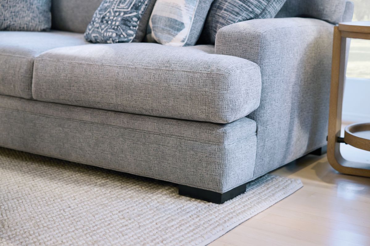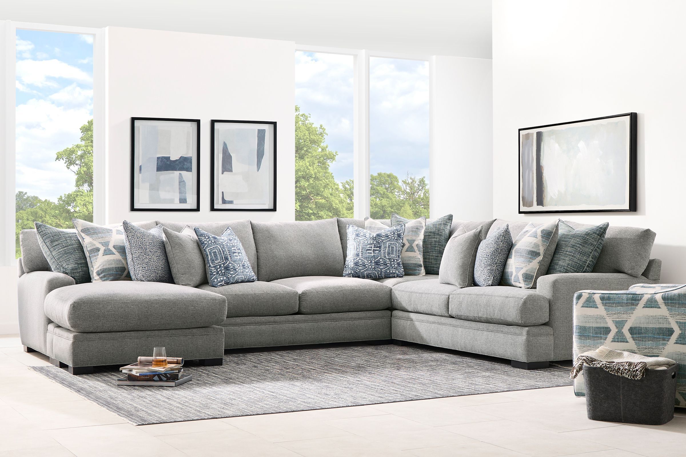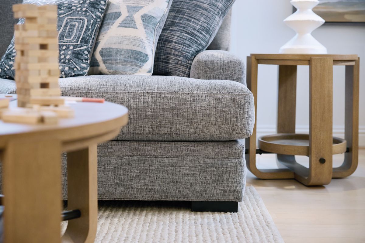 The Bulova Sectional is an ideal large-scale centerpiece for your living area, marrying contemporary charm with deep-seated comfort. The classic track arm design, enhanced by colorful toss pillows, provides a stylish and sophisticated look. Proudly crafted in the USA, this oversized seating collection accommodates the entire family comfortably. The neutral grey fabric integrates well with various color schemes, and the vibrant toss pillows offer a pop of color. Enjoy endless family movie nights on the elegant Bulova Sectional.
