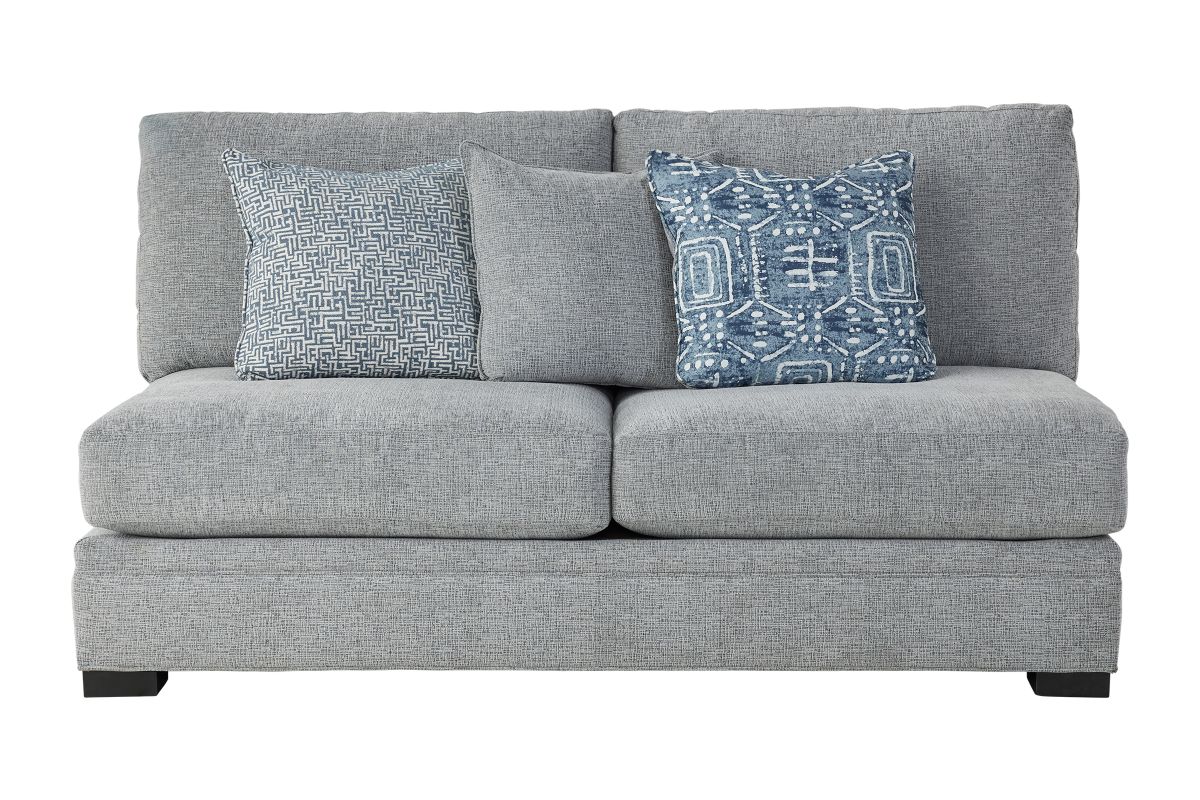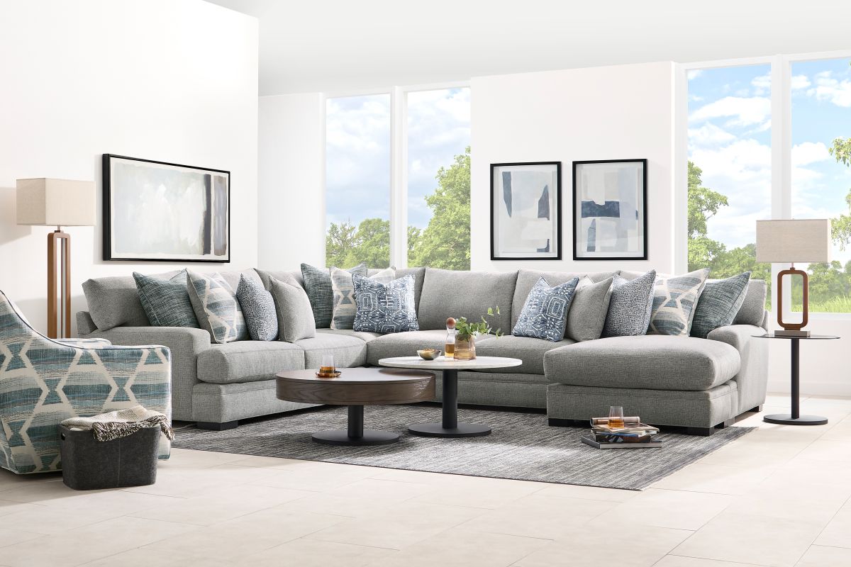 The Bulova Sectional is an ideal large-scale centerpiece for your living area, marrying contemporary charm with deep-seated comfort. The classic track arm design, enhanced by colorful toss pillows, provides a stylish and sophisticated look. Proudly crafted in the USA, this oversized seating collection accommodates the entire family comfortably. The neutral grey fabric integrates well with various color schemes, and the vibrant toss pillows offer a pop of color. Enjoy endless family movie nights on the elegant Bulova Sectional.