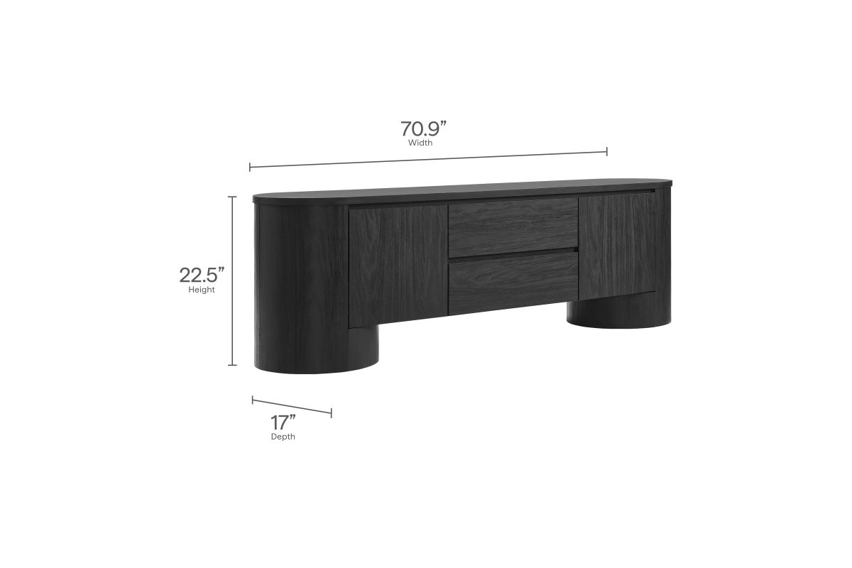 Grounded in modern design with a bold silhouette, the Duval Oval TV Stand brings both character and storage to your space. Measuring 71 inches long, it features a soft, rounded profile and a smooth matte finish that gives it a sculptural look in any living room TV stand setup. Two spacious drawers sit between flanking cupboards with soft-close hinges, offering generous storage for media, remotes, and more. Pairing beautifully with wall mount TVs, the Duval TV entertainment center features three cut-out holes with covers along the back for easy cable management, keeping wires tucked neatly out of sight. Its circular plinth-style bases add stability and flow seamlessly into the curved silhouette, giving this mid-century media cabinet its distinctive presence. With a clean silhouette and hidden storage, Duval is a striking piece and fits well in minimalist or modern organic homes. Weight capacity: 200 lbs.