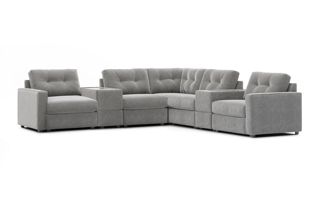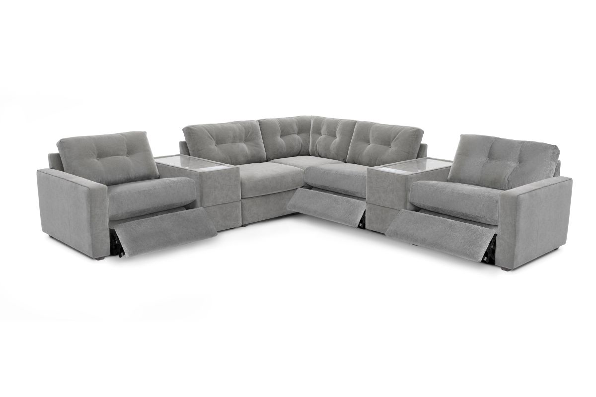 Included Pieces: LAF power reclining chair, two media consoles, one armless chair, corner, armless recliner, and RAF power reclining chair.Visit a showroom to explore individual components and work with a sales specialist to configure your perfect design.