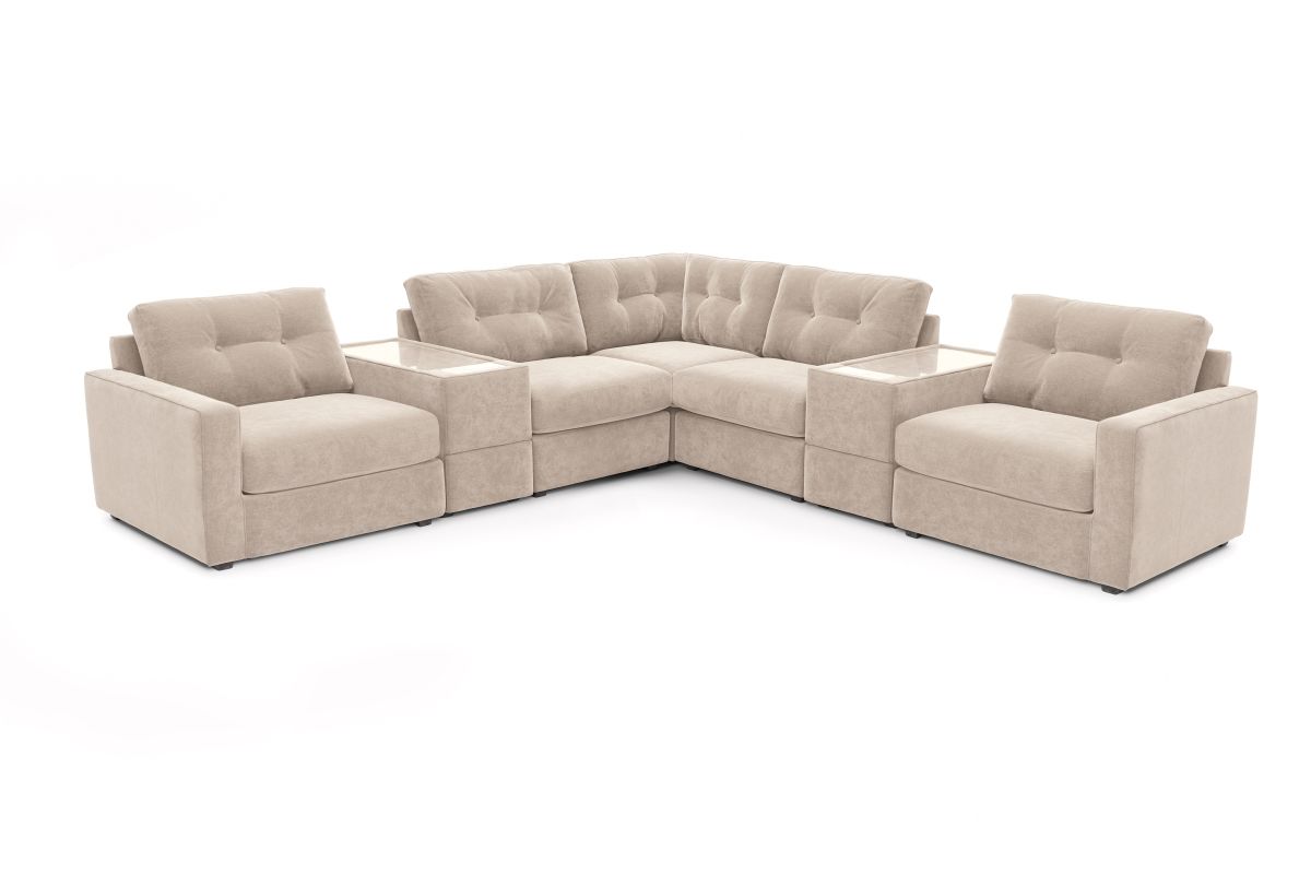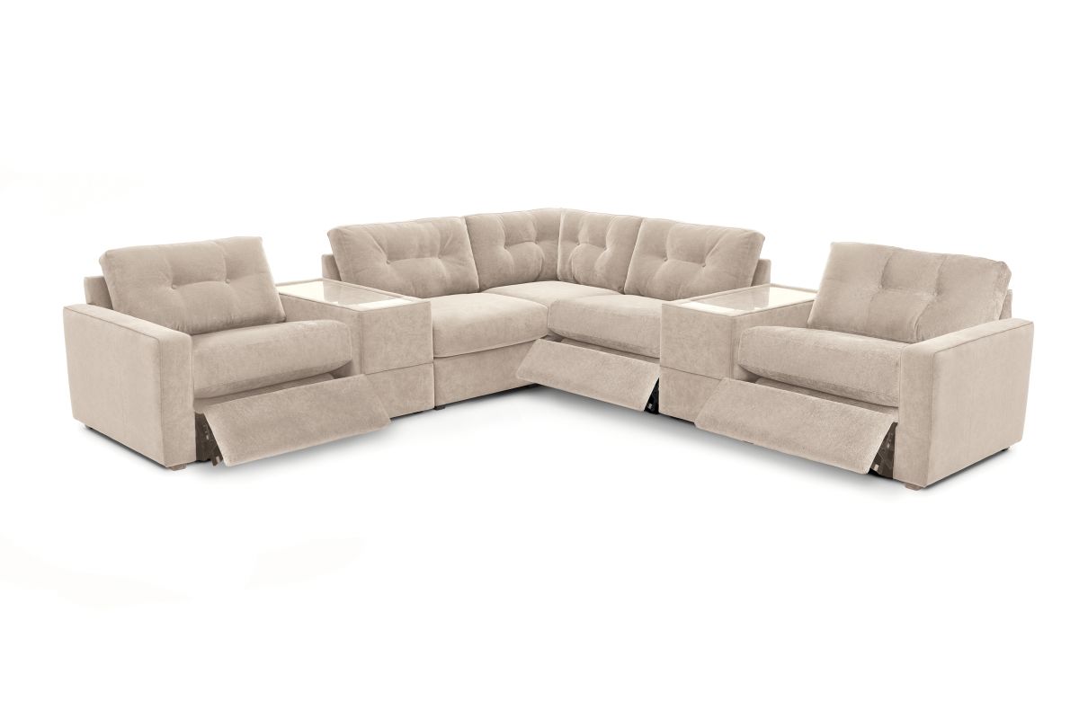 Included Pieces: LAF power reclining chair, two media consoles, one armless chair, corner, armless recliner, and RAF power reclining chair.Visit a showroom to explore individual components and work with a sales specialist to configure your perfect design.