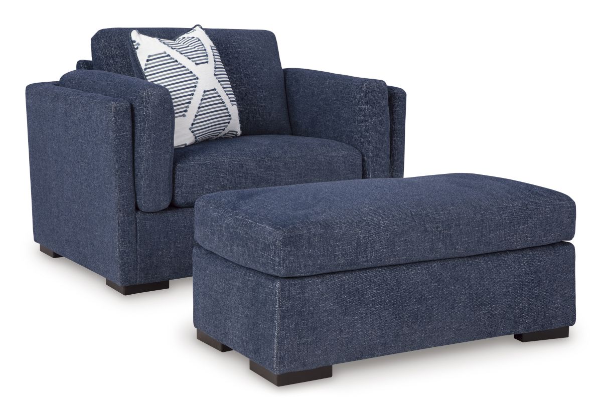 The Evansley Navy Chair and Ottoman set adds bold style and comfort to any room. Plush cushioning and supportive seating make it perfect for lounging. The ottoman enhances versatility and relaxation. A striking accent piece on its own or paired with the full set.