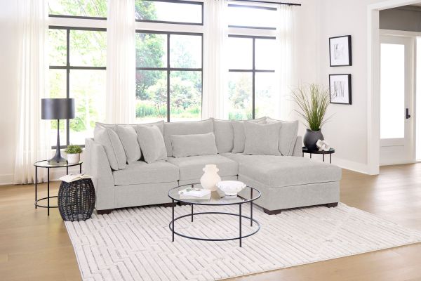 The Plush Ivory 3-Piece Sectional with Right Arm Facing Chaise brings a fresh, airy elegance to your living space while delivering exceptional comfort. Upholstered in a soft ivory fabric, this collection brightens the room with a clean, timeless aesthetic that feels both inviting and refined. Tailored pie crust welt detailing adds subtle definition, giving each piece a polished, handcrafted finish.