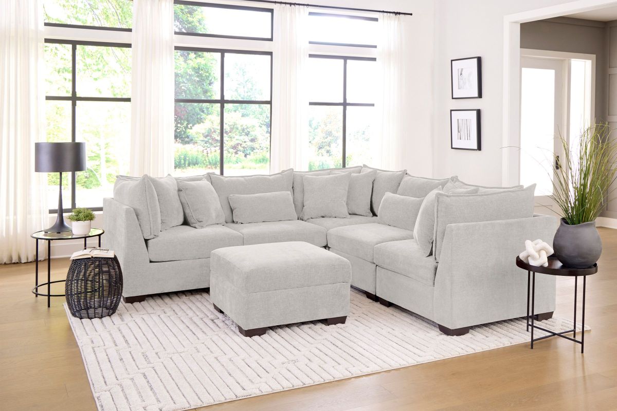 With its neutral ivory tone and versatile design, the Plush Ivory 5-Piece Sectional pairs effortlessly with a wide range of décor styles, from modern and contemporary to soft transitional interiors, making it a beautiful and enduring foundation for any living room.