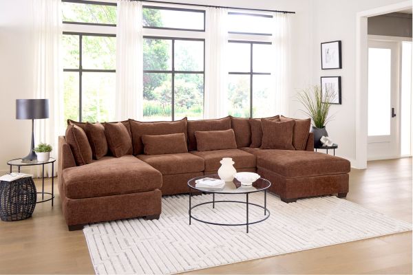 Make a bold yet cozy statement with the Plush Rust 4-Piece Sectional with Dual Chaises. Designed for both comfort and visual appeal, this spacious sectional features a tailored pie crust welt that adds a refined, handcrafted touch. Self-upholstered accent pillows enhance the cohesive look while providing extra lounging comfort.