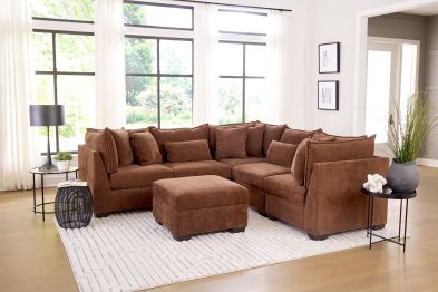 Make a bold yet cozy statement with the Plush Rust 5-Piece Sectional with Ottoman. Designed for both comfort and visual appeal, this spacious sectional features a tailored pie crust welt that adds a refined, handcrafted touch. Self-upholstered accent pillows enhance the cohesive look while providing extra lounging comfort.