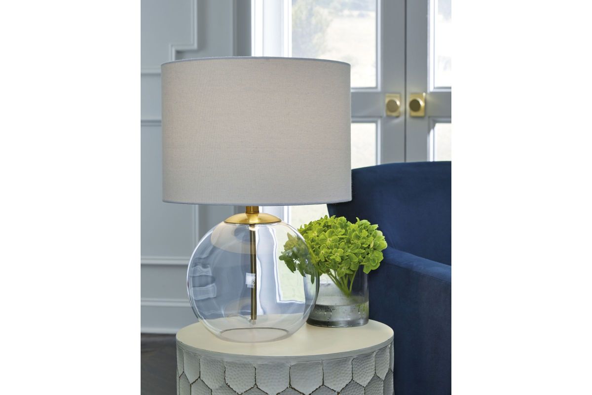 - Lamp is made of glass and metal with drum hardback fabric shade