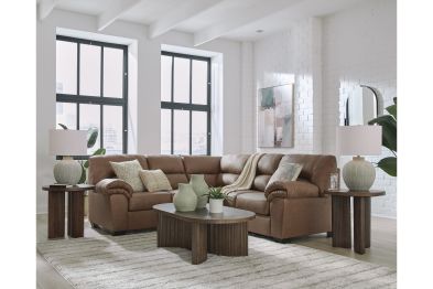 Create a warm, inviting living space with the Willowbend Caramel 8-Piece Living Room Set. Anchored by a left-facing 2-piece sectional upholstered in a rich caramel tone, this set offers comfortable seating in a streamlined footprint ideal for everyday living. A matching recliner adds relaxed functionality, while a coordinating coffee table, two end tables, two lamps, and a complementary area rug complete the look for a cohesive, fully furnished living room.
