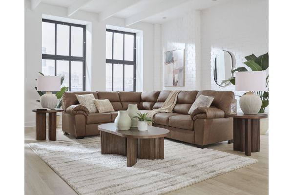 Designed for expanded comfort, the Willowbend Caramel 8-Piece Living Room Set features a left-facing 3-piece sectional upholstered in a warm caramel tone. This configuration provides generous seating with a relaxed, contemporary feel. A matching recliner enhances comfort, while coordinating tables, two lamps, and a complementary area rug complete the space for a fully finished living room ideal for entertaining and everyday lounging.