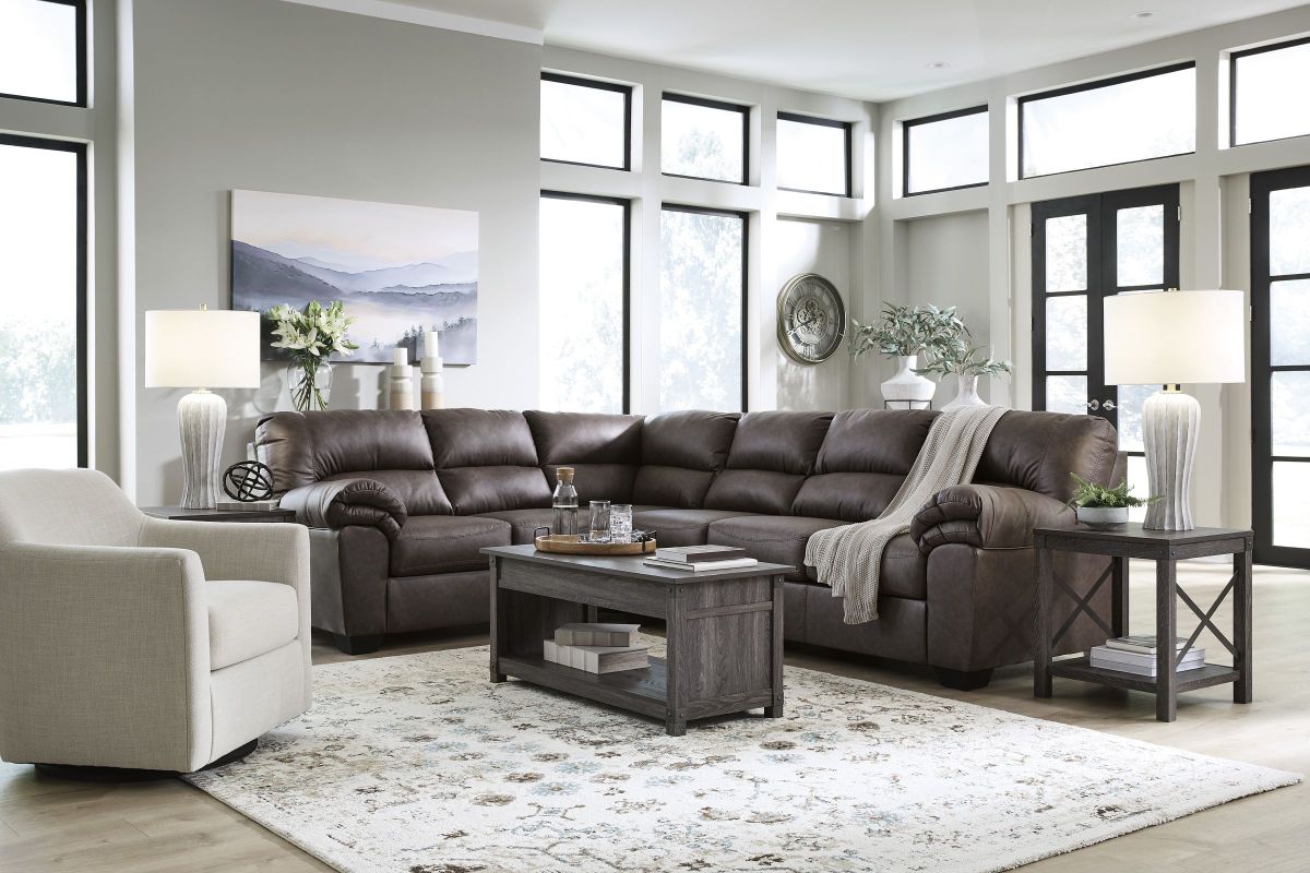 The Willowbend Umber 8-Piece Living Room Set delivers a complete, spacious living room solution with elevated style. Featuring a right-facing 3-piece sectional, this set offers ample seating paired with a matching recliner for everyday comfort. Finished with coordinating tables, two lamps, and an area rug, it provides a cohesive and inviting space designed for relaxing and entertaining.