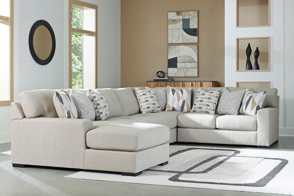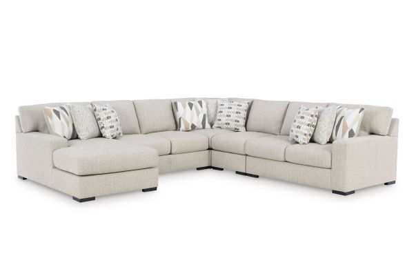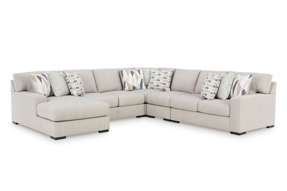 Looking for a centerpiece to complete your effortlessly chic and functional living room? The versatile character and ultra-plush cushions of the Sunday 5-Piece Sectional with Left Arm Facing Chaise make it an ideal fit for your relaxed lifestyle. Casual and contemporary with track arms and an inviting neutral hue, it pairs easily with your existing aesthetic. And its high-performance Next-Gen Nuvella™ upholstery makes maintenance a breeze, so you can spend less time sweating life’s little messes. Simply unzip the cushion or pillow covers and toss them in the wash for easy cleaning.